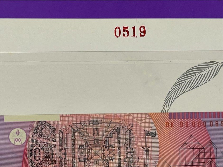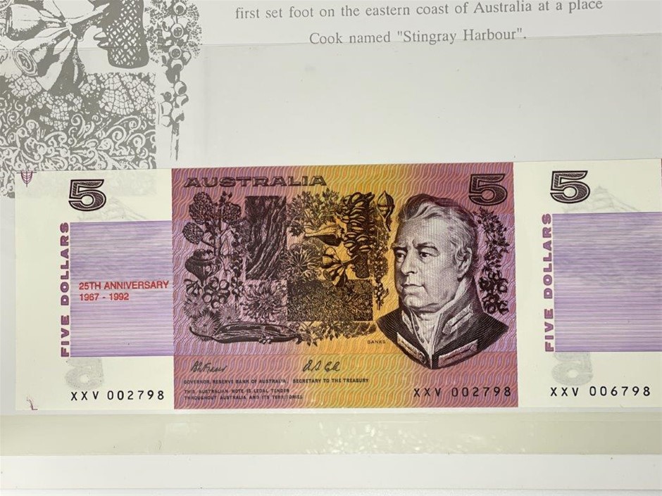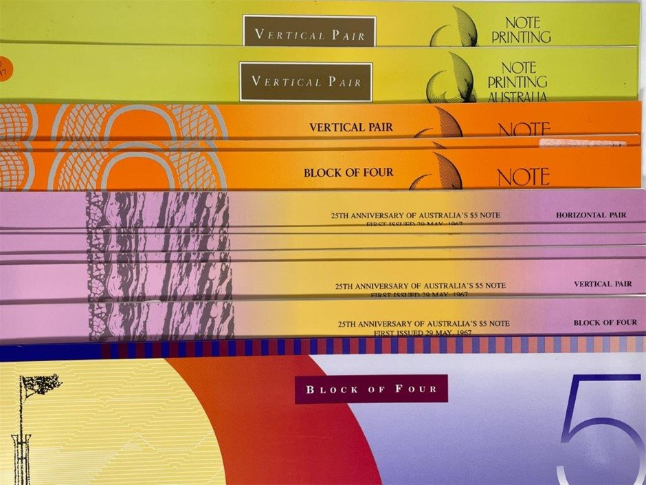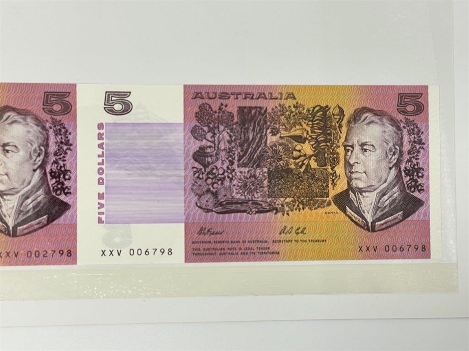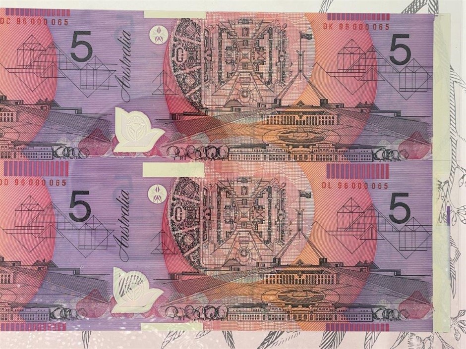 10 x $5 paper banknotes (4 x Pair, 1 x Vertical Pair) Fraser & Cole in commemorative folder w/ XXV serial numbers issued at Numismatic Association of Australia`s International Coin & Banknote Fair Adelaide, 1992. Each pair is uncut. Serial no. XXV 009135, XXV 009635, XXV 002798, XXV 006798, XXV 003298, XXV 007298, XXV 002409, XXV 006409, XXV 002298, XXV 006298