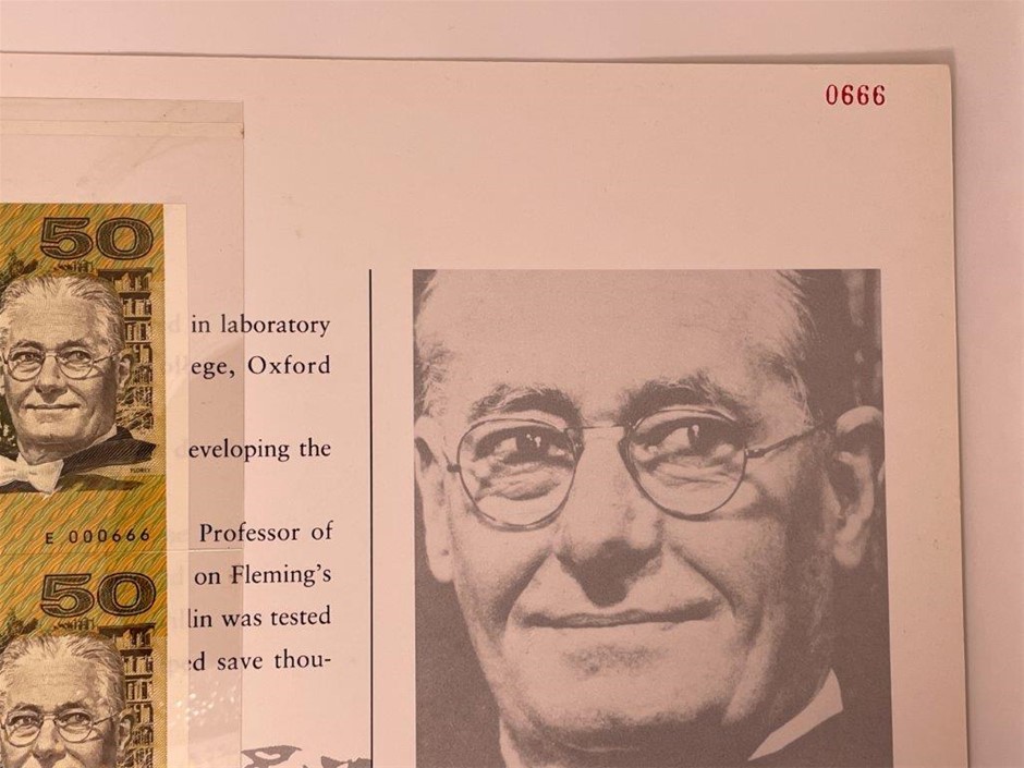 2 x $50 paper banknotes (1 x Vertical Pair) Fraser & Evans in commemorative folder w/ black serial numbers. Each pair is uncut. Serial no. E000666, F 000666