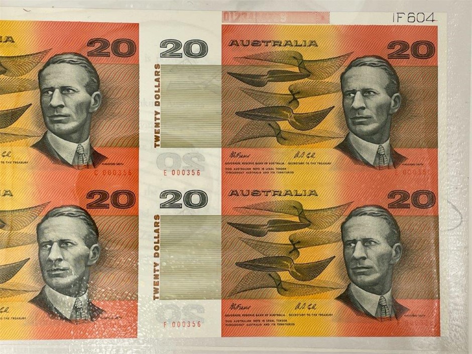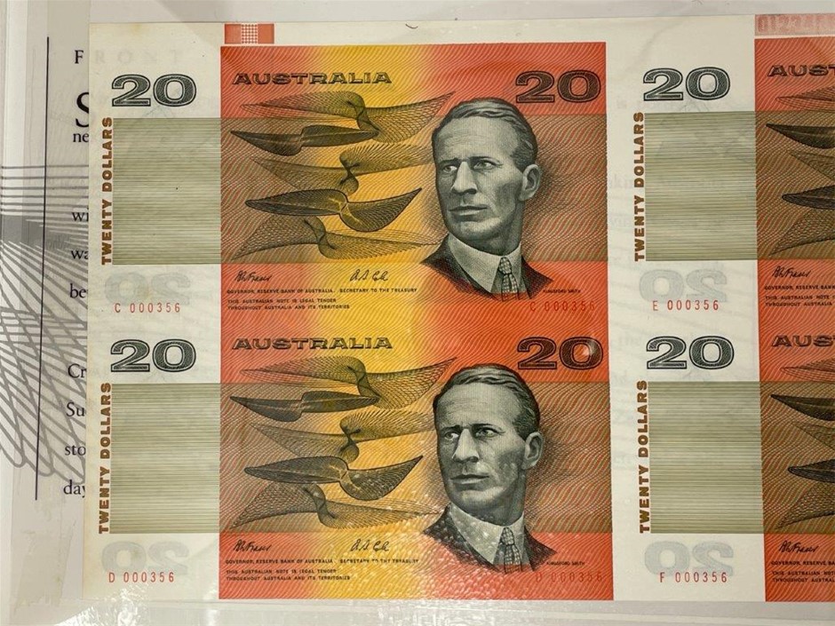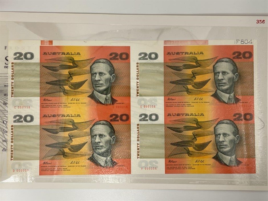 4 x $20 paper banknotes (1 x Block of 4) Fraser & Cole in commemorative folder w/ red serial numbers. This block of four is uncut. Serial no. C 000356, E 000356, D 000356, F 000356