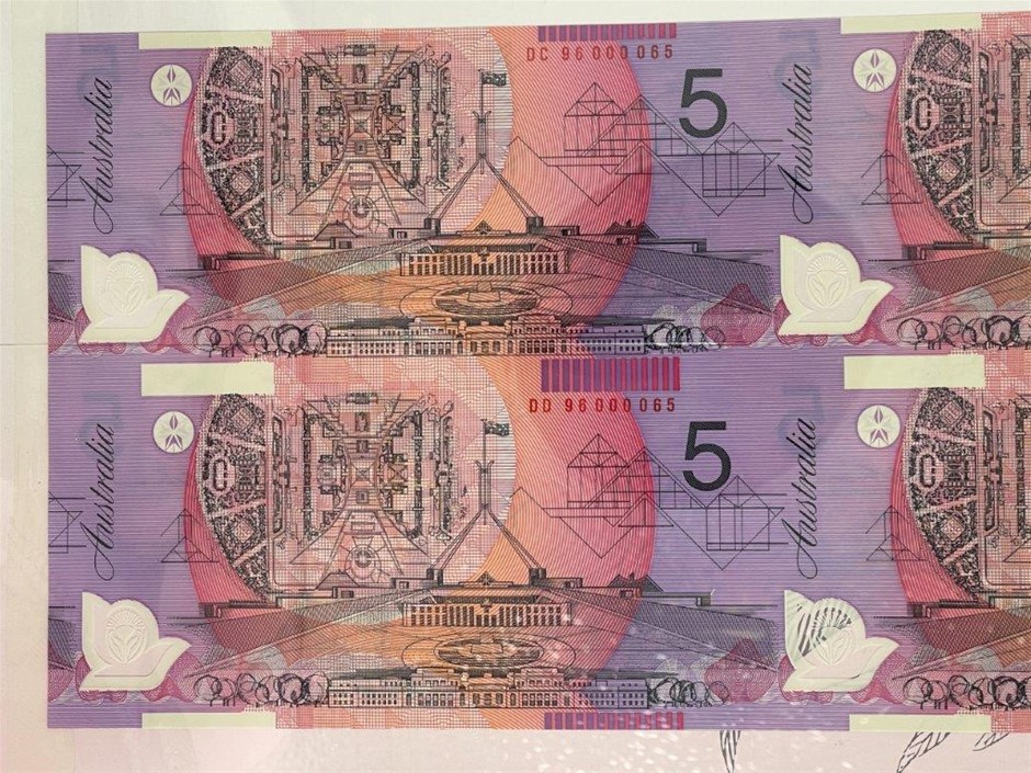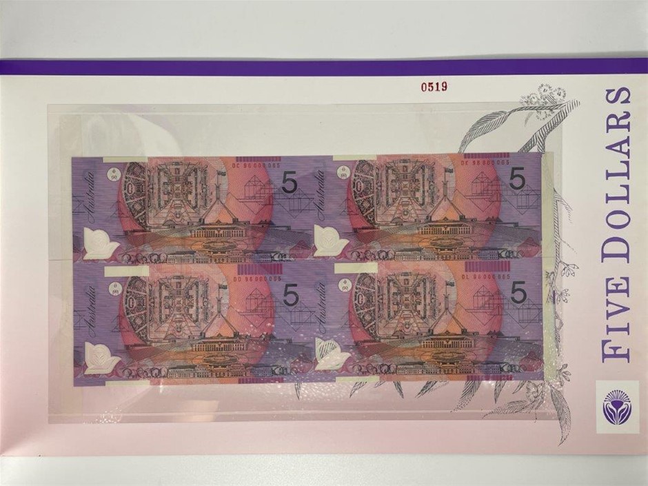 4 x $5 polymer banknotes (1 x Block of 4) Fraser & Evans in commemorative folder w/ red serial numbers. This block of four is uncut & issued in 1996. Serial no. DC 9600065, DJ 96000065, DD 96000065, DL 96000065