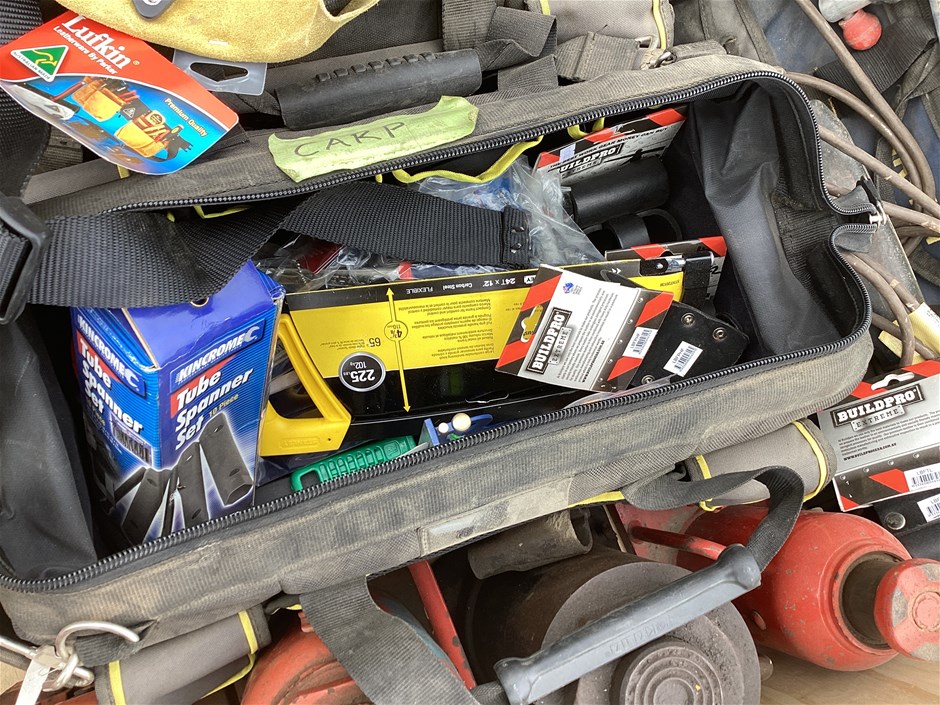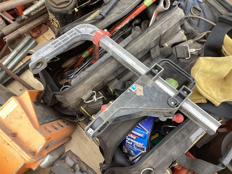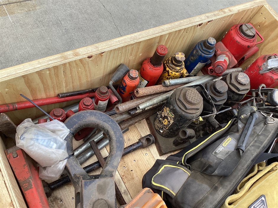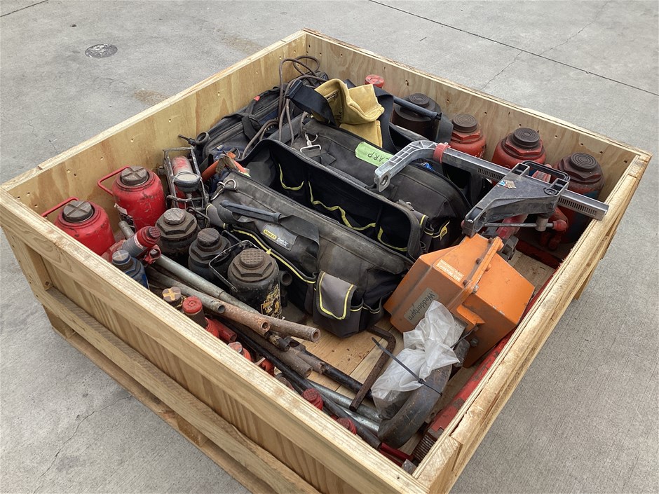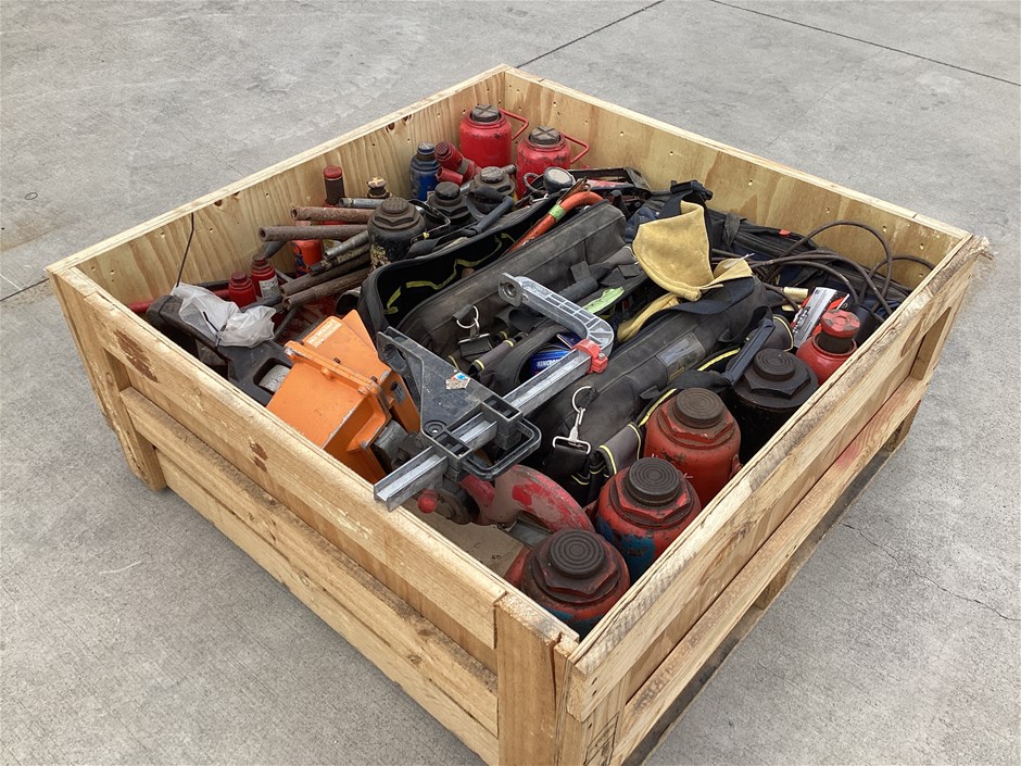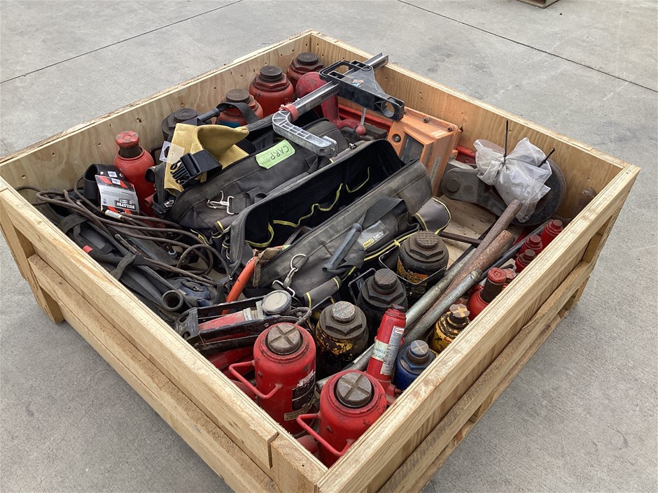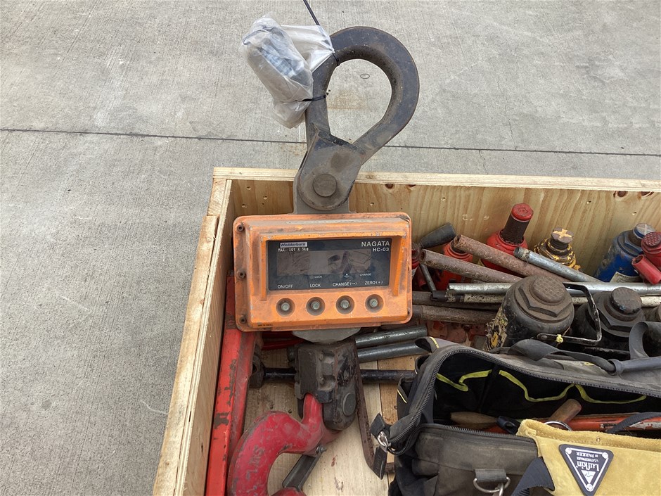 • Includes assorted hydraulic jacks sizes 1.8T to 32T, Wedderburn crane scales, workshop tools, clamps, pipe wrench and more. Refer to photos for more information