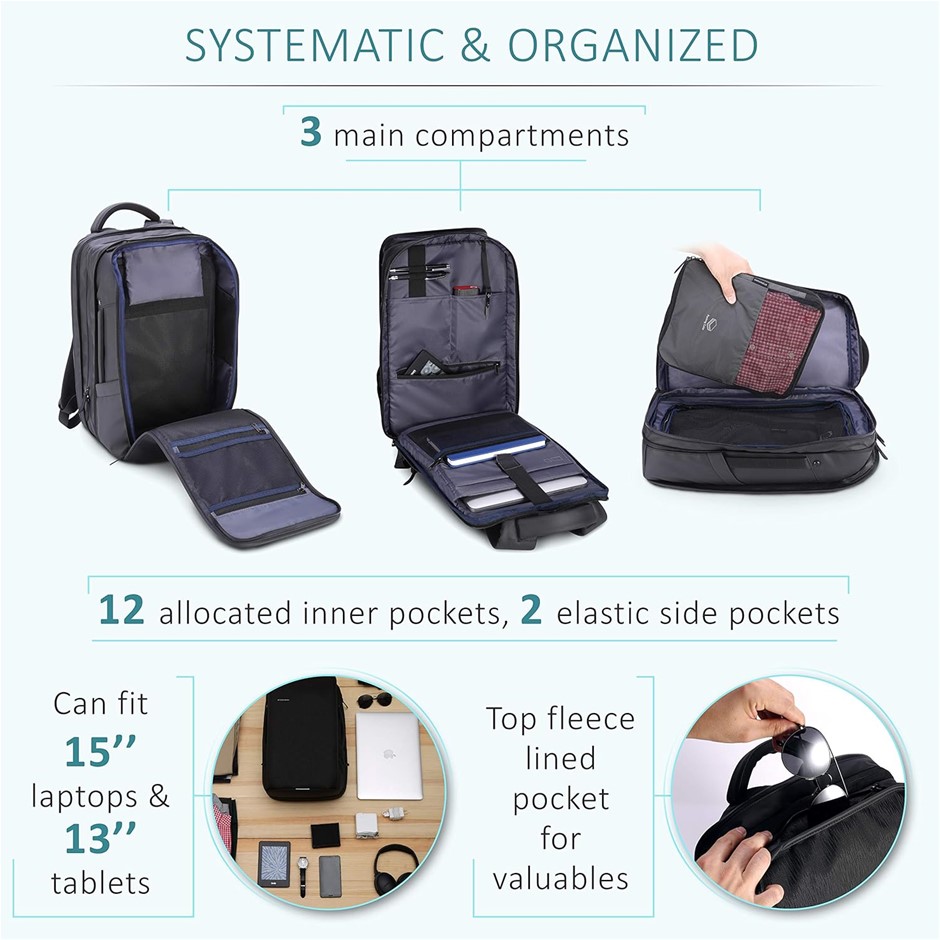 STERKMANN Expandable Carry-On Backpack, Fits 15`` Laptop, Includes: Packing Cube, Shoe Pouch & Laundry Bag, Capacity: 20L-30L. NB: has been used, front pocket zip pulls disconnected from other side, word detailing on front peeling. (Code: B0CCYT26M4-U1) (334887-257)