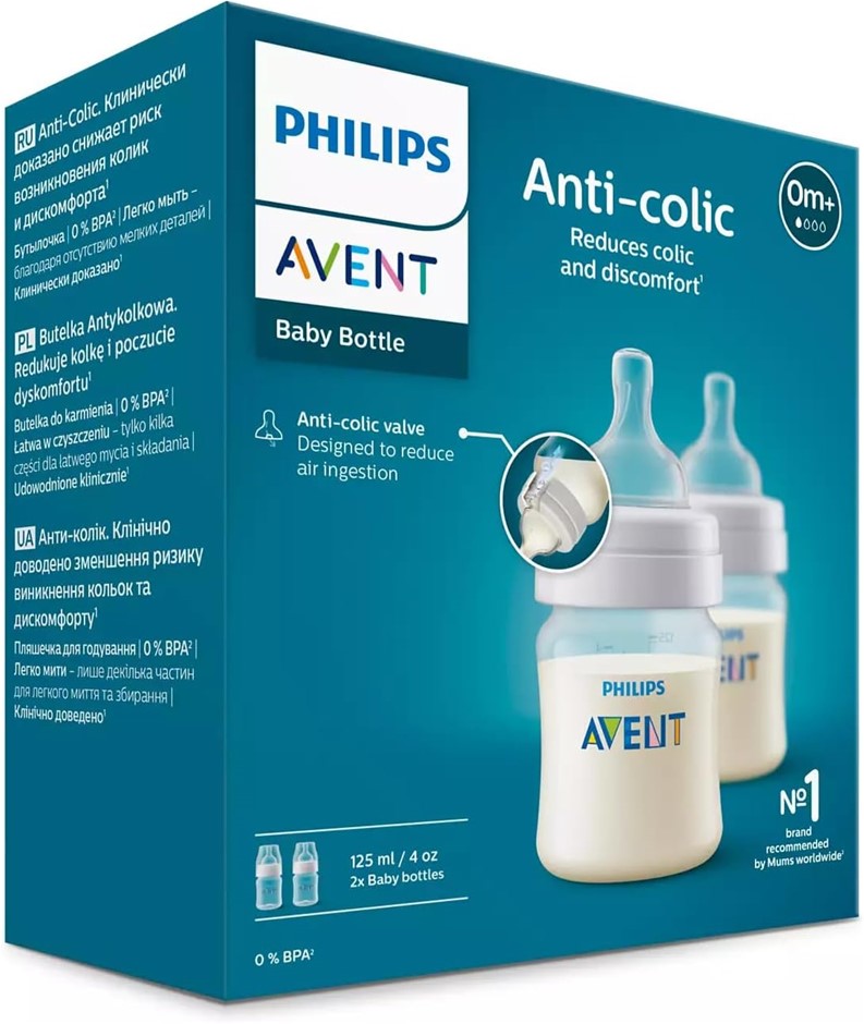PHILIPS AVENT Anti-Colic Baby Bottles, 125ml, 2-pack, SCY100/02. NB: Slightly Damaged Box. (Code: B0CHFM8QNS-SDB) (333524-264)