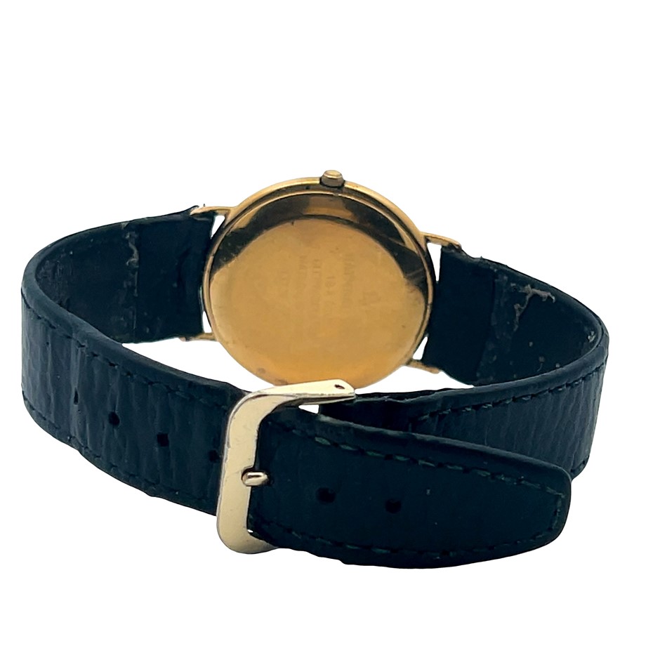 • black leather strap with gold-tone buckle Note: strap loop missing