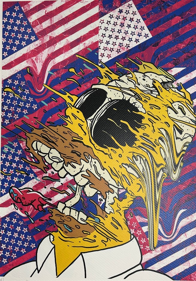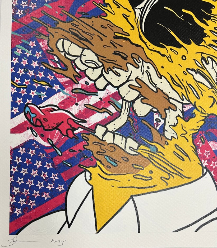 • Death NYC Signed Street Art Print ``Holmer Simpson/Flag``, signed lower left, number 80/100 lower right, 300 mgs fine art paper, embossed watermark lower left in image, image measures 41.5x29.5cm, total sheet measures 45 x 32cm. Certificate of authenticity provided by Death NYC.