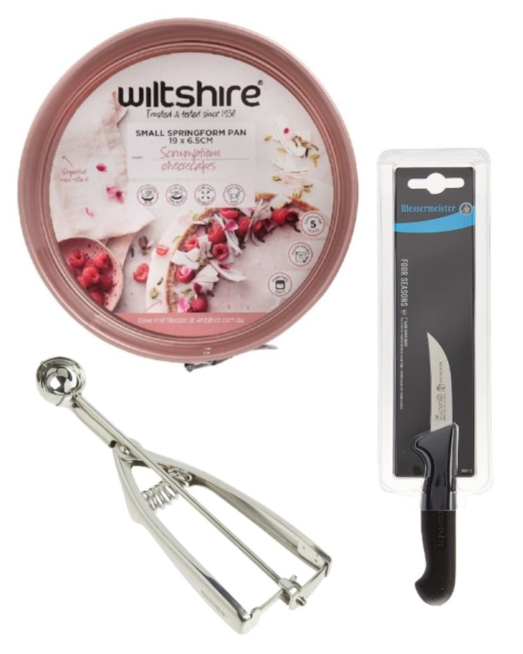 3 x Assorted Kitchen Items: x1 NORPRO 675 Scoop, Stainless Steel, 7.5-Inch, 0.25 Ounces, x1 MESSERMEISTER Four Seasons Garnishing Knife, Black 50012, x1 WILTSHIRE Rose Gold Non Stick Springform Pan - 19cm. You must be 18 years or older to purchase this product. (Code: B00004UE83-B1) (331952-305)
