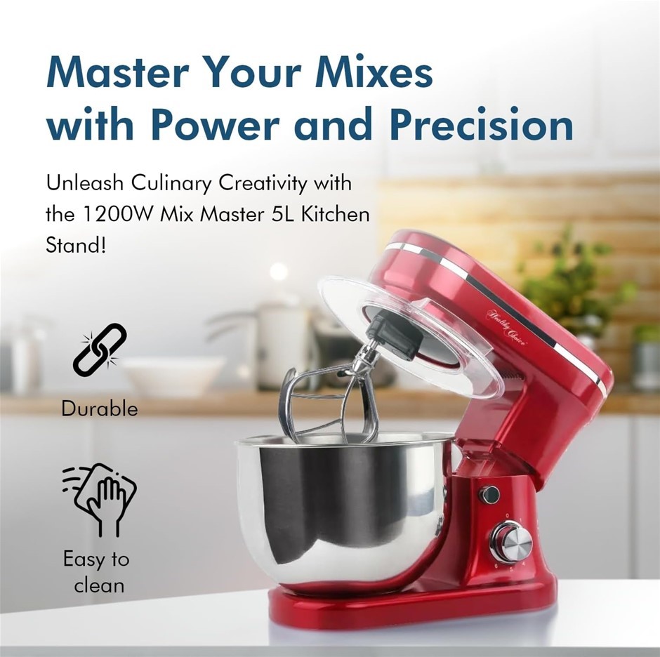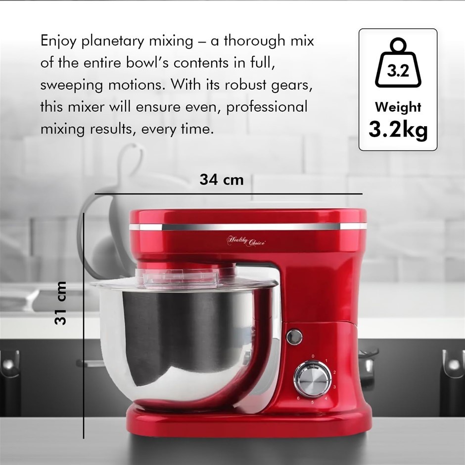 HEALTHY CHOICE 400W Stand Mixer, Electronic Speed Settings, 5L Stainless Steel Bowl, Pouring Shield, Red. NB: Has been used, Not in Original Box & Missing Some Accessories. (Code: B07XF5G5WX-MU-NOB2) (333403-331)