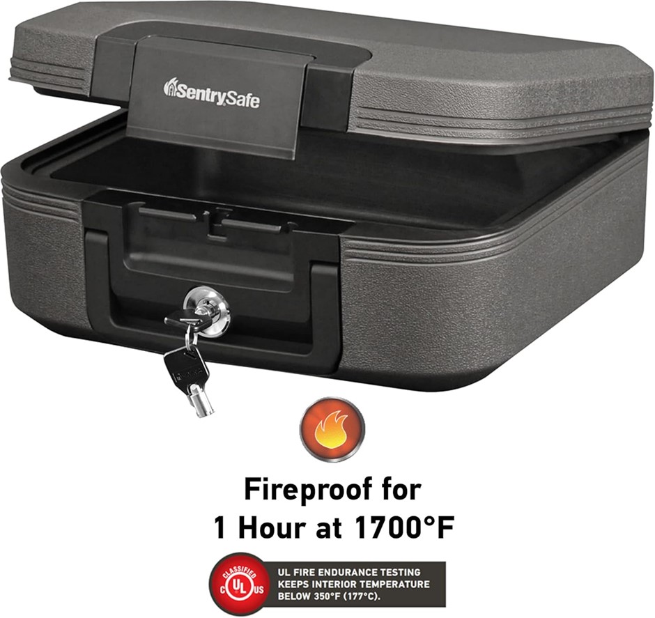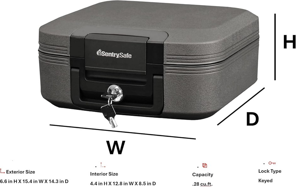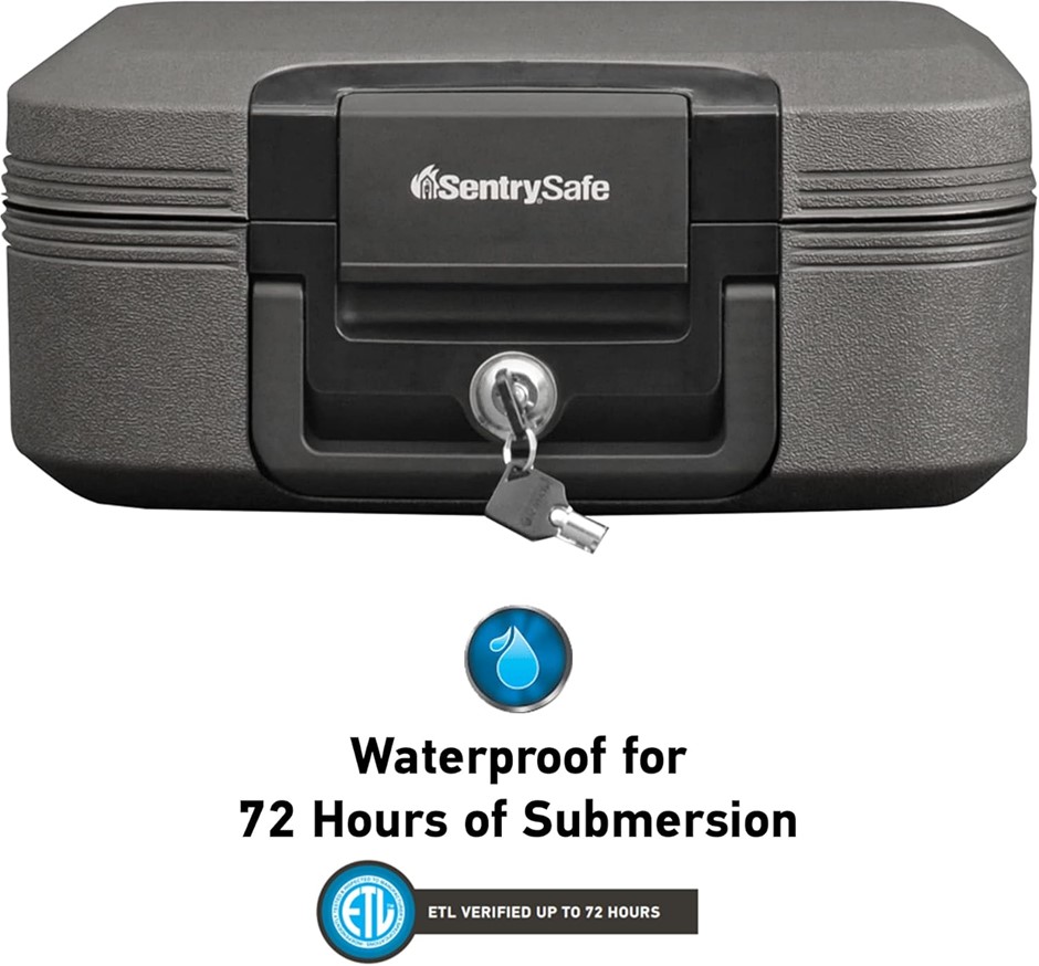 SENTRYSAFE Dark Gray Fireproof and Waterproof Safe with Key Lock, Chest Lock Box with Carrying Handle for Travel, 0.28 Cubic Feet, 6.6 x 15.4 x 14.3 Inches, CFW20201. NB: Slightly damaged box during storage. (Code: B00MV7MYRM-NE-SD1) (333121-334)