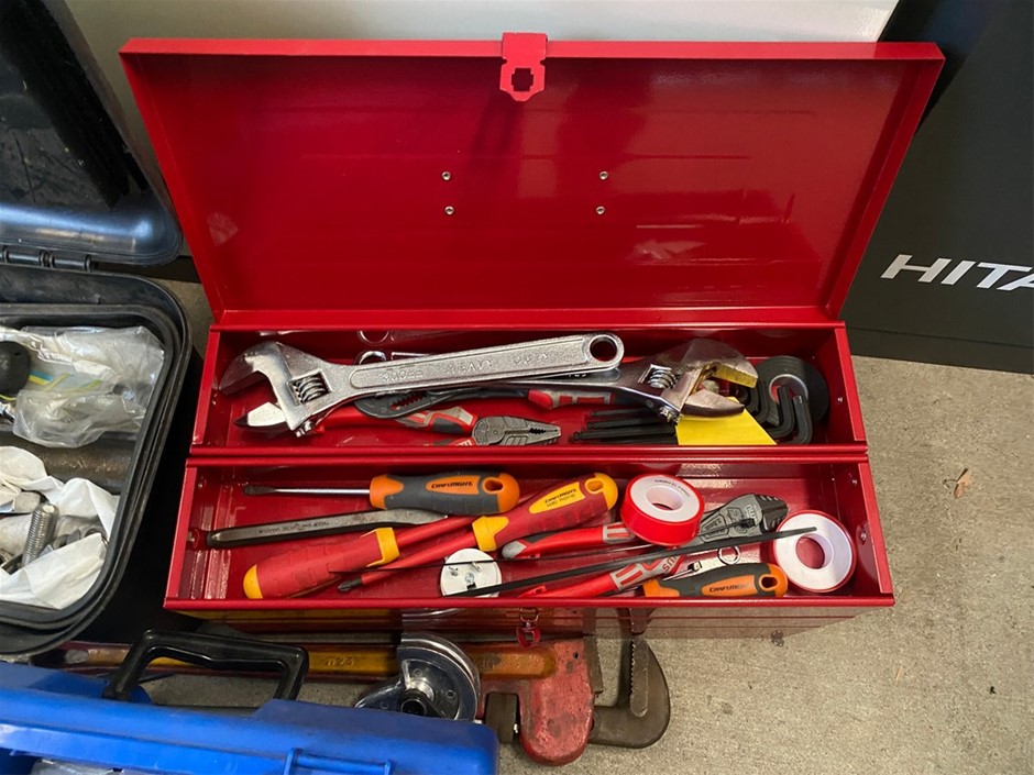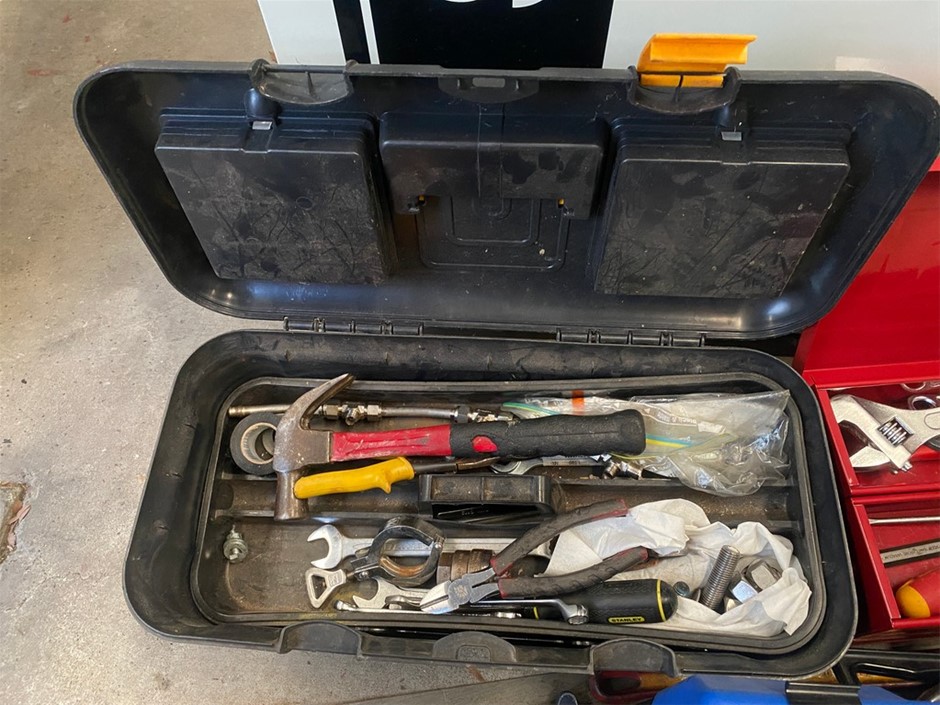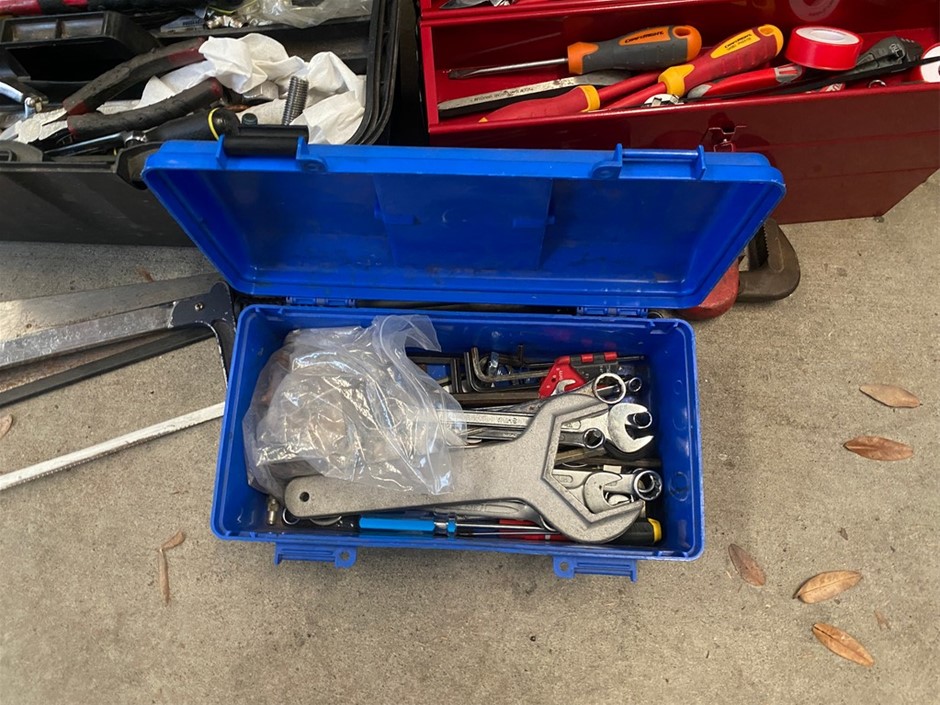 • 1 x Plastic tool box (1 Clip missing), hammers, spanners, tape measure plus more