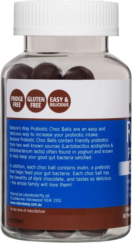 4 x NATURE`S WAY Restore Probiotic+ Choc Balls, 60 Premium Dark Chocolate Balls, 150g. Buyers Note - Discount Freight Rates Apply to All Regional Areas(Code: B07BWGV7DT-K4) (331865-368)