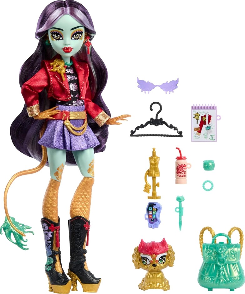MONSTER HIGH Jinafire Long Doll, Dragon with Pet Dog Cloudy “Yun Yun” and Accessories. (Code: B0D7PV2K6D-NE) (333403-383)