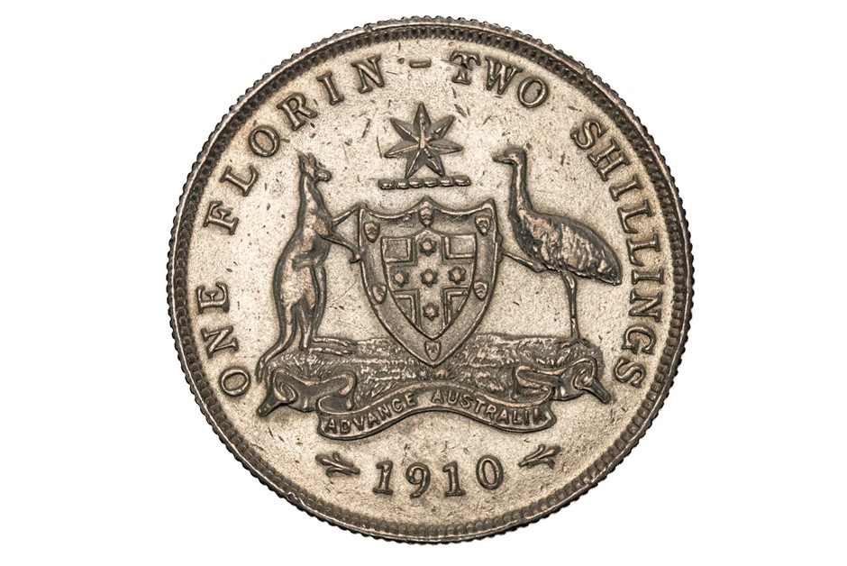 1 x 1910 Florin w/ obverse side, Edward VII. Very fine. Approx. 11.31gm.
