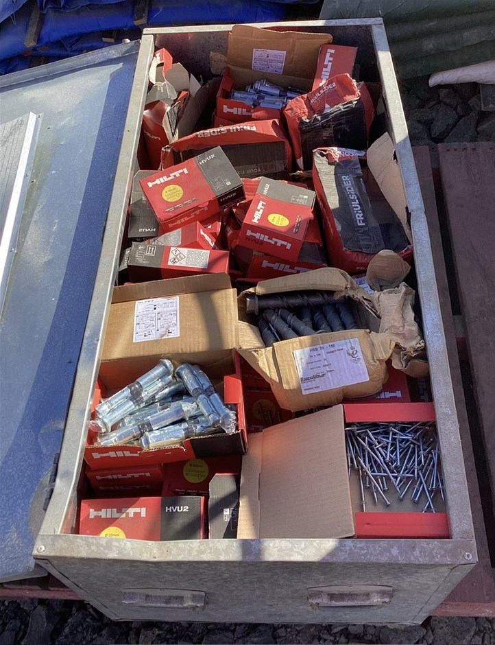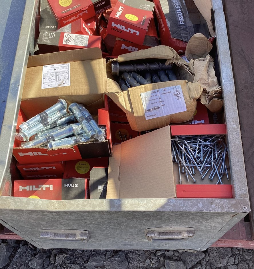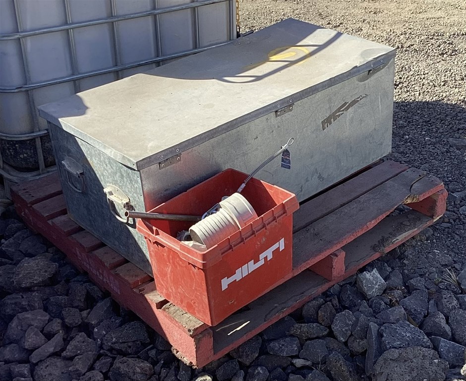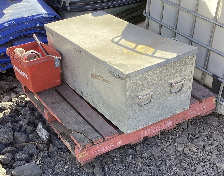Pallet with Storage Box, Assorted Tools and Fasteners