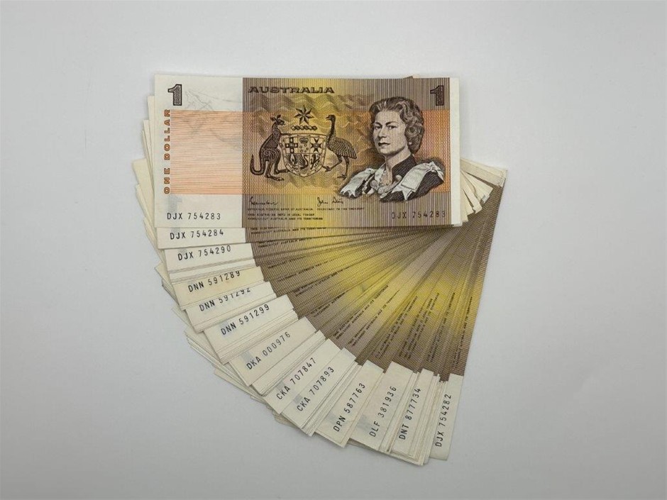 Approx. 75 x Australian $1 paper banknotes Johnston & Stone C:1982-84