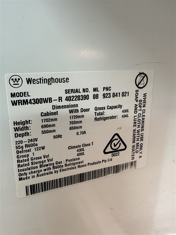 WESTINGHOUSE 430L single door upright fridge