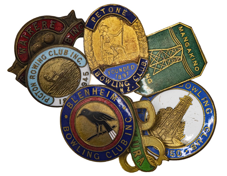 7 x NZ assorted gilt & enamel bowling club badges w/ pin-back including: