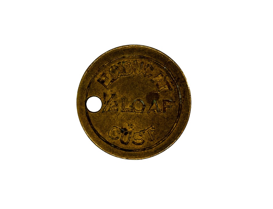E.C.Ducat 1/2 Loaf Cust. brass bread token. Pierced at left. Rare