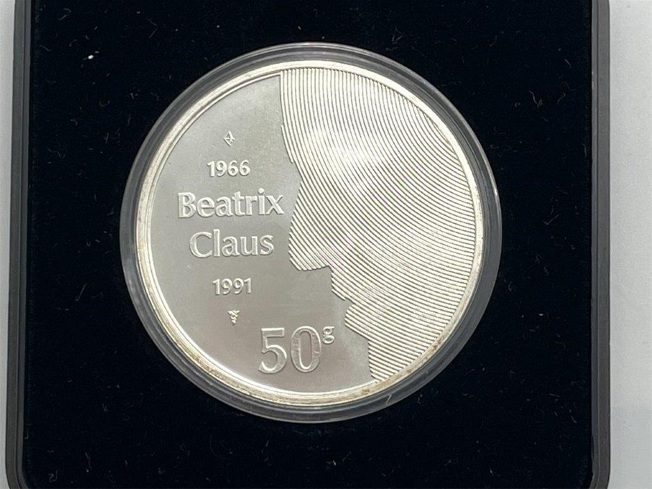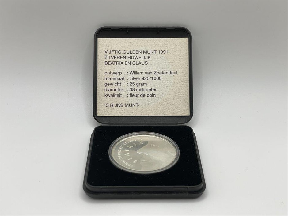 • 1 x Dutch 50 Gulden 1991, 25th Anniversary of the Wedding of Beatrix and Claus, Silver (.925), Approx. weight 25gm