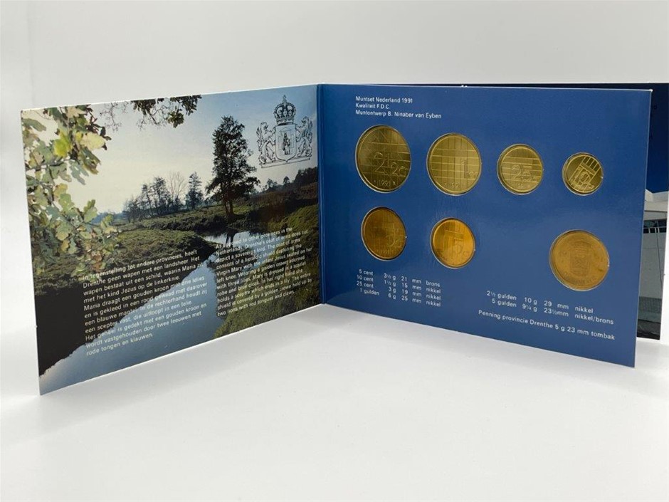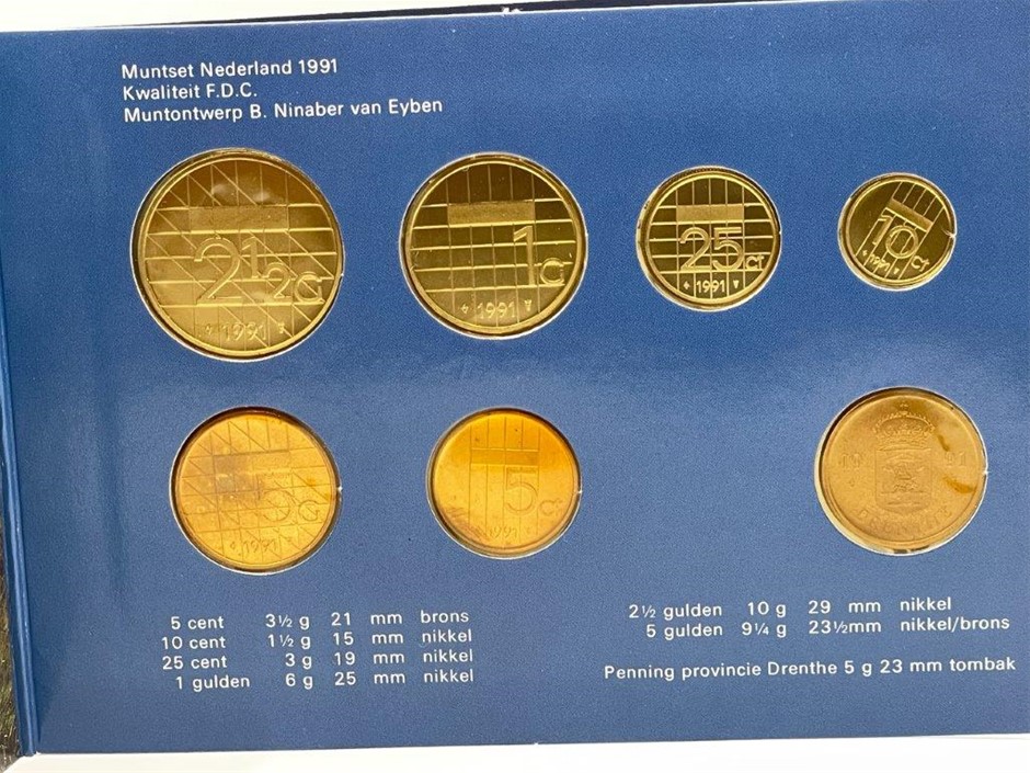 • 5 x set of 7 Dutch Mint, Guldens and cents, 1989 - 1991, 1993, presented in original packaging