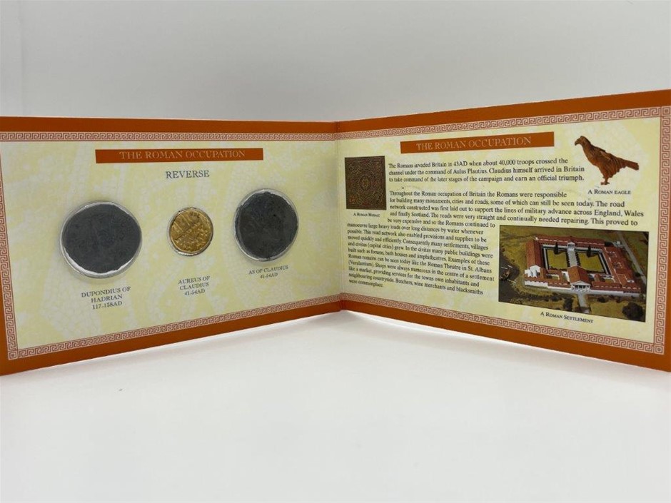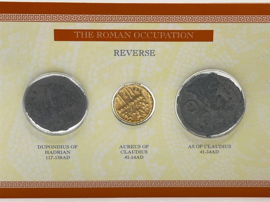 • 1 x set of 3 The Roman Occupation, 1 x Dupondius of Hadrian 117-138AD, Aureus of Claudius 41-54AD, As of Claudius 41-54AD, presented in original packaging