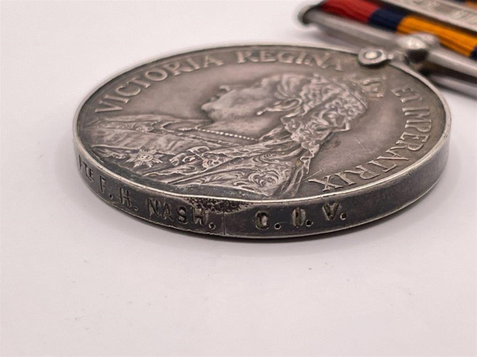 • Four Bars, Cape Colony, Paardeberg, Driefontein, Johannesburg, Pte F.H. Nash C.I.V. Impressed, with ribbon and bar, edge knocked, Approx. 95 x 35mm, including ribbon, Very fine.