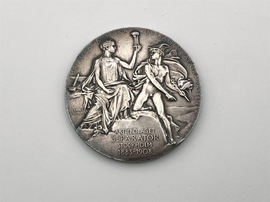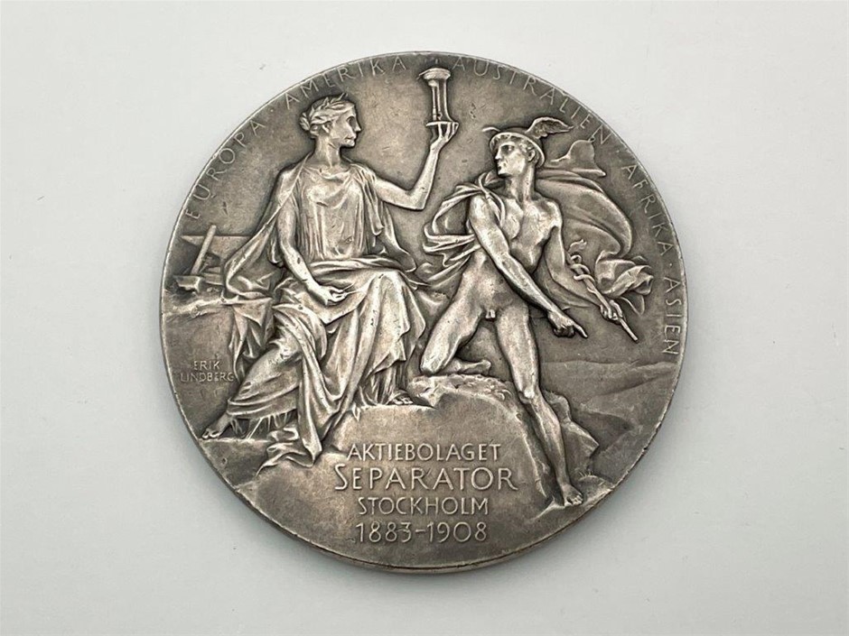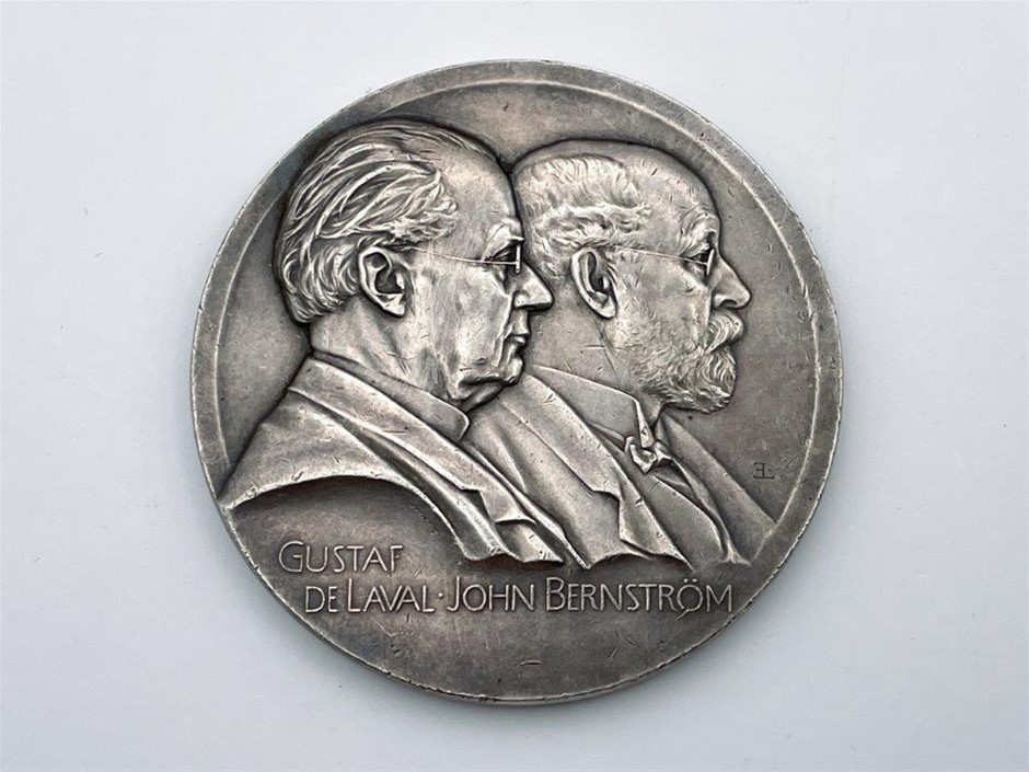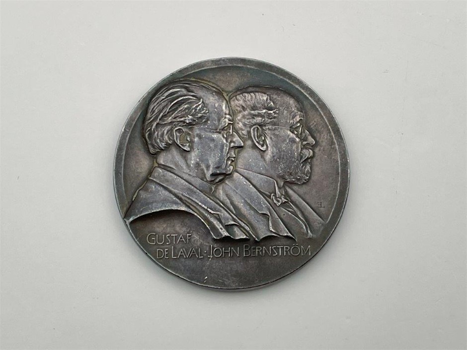 • 2 x Swedish, Gustaf De Laval & John Bernstrom, inscribed on reverse ` Aktiebolaget Separator Stockholm 1883-1908`, by Erik Lindberg, Silver, 50mm & 61mm dia Approx. Weight 72.4gm & 131.5gm