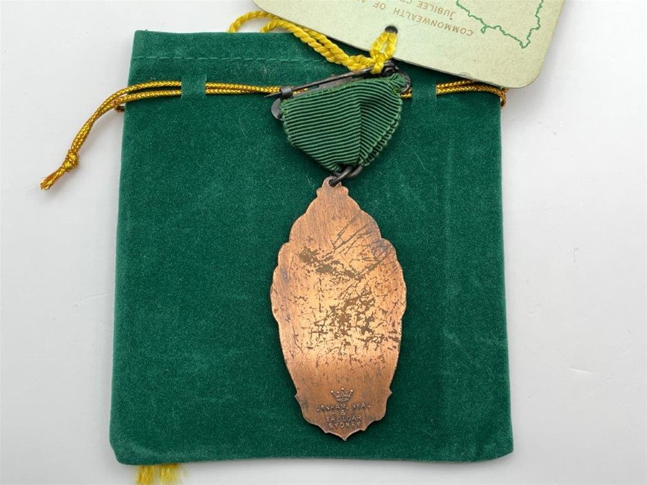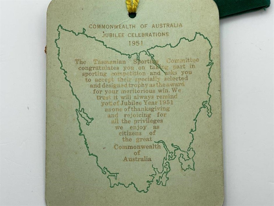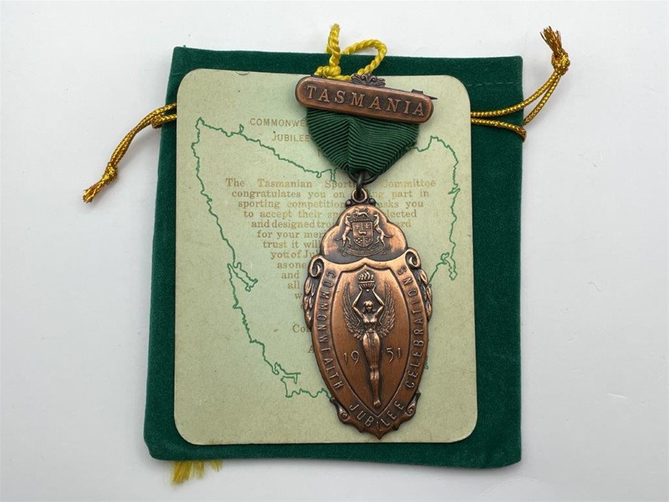 • 1 x 1951 Commonwealth Jubilee Celebrations, top bar inscribed `Tasmania`, in bronze medal, awarded to participant by the Tasmanian Sporting Committee, no name inscribed, approx. 86mm x 36mm, comes with information card & green velvet satchel, nearly extremely fine.