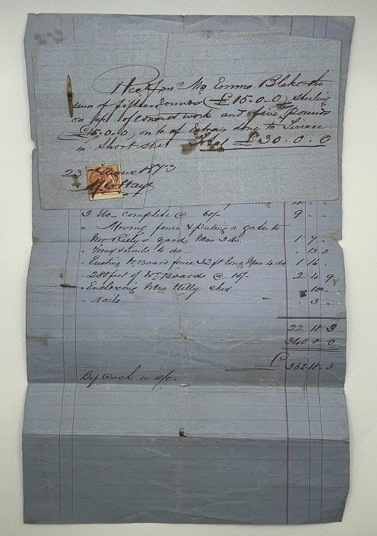 • 1 x 1873 Invoice and receipt with duty stamp with reference to Mrs. Emma Blake