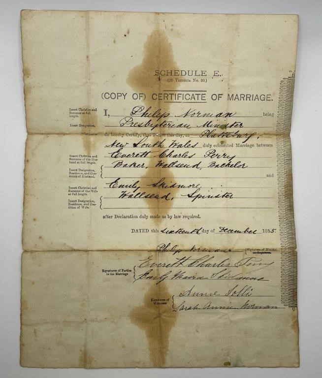 • 1 x New South Wales, 1885 Certificate of Marriage for Everett Charles Perry and Emily Pridemore