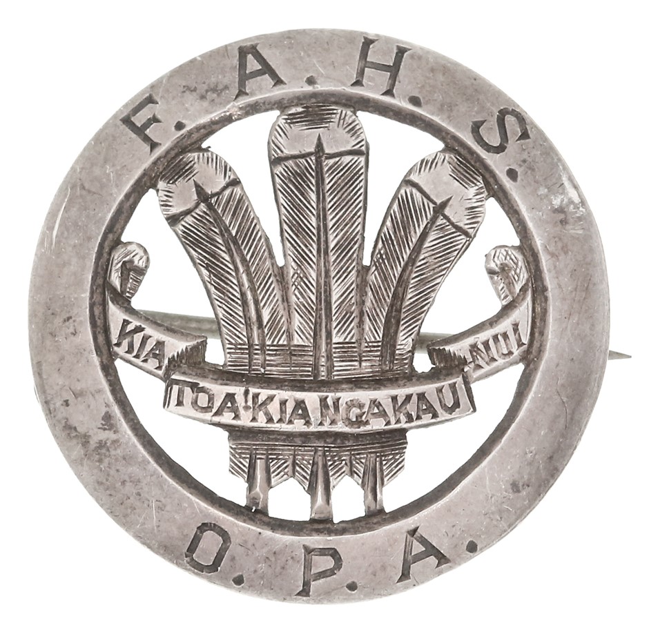 F.A.H.S. (Feilding Agricultural High School) O.P.A. (Old Pupils Association), c1920s, badge handcrafted in voided silver (26mm), no maker, pin-back. Toned, very fine.