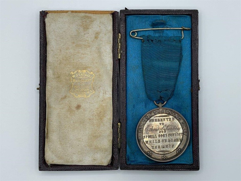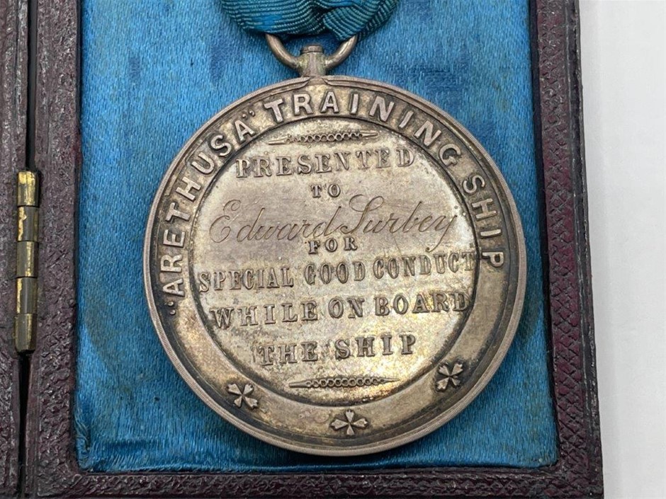 • 1 x Arethusa Training Ship Good Conduct medal in silver(33mm, 23gm -silver weight). Edward Turbey, engraved on reverse. Very fine and scarce. Together with original presentation case by W.J. Taylor, Medallist