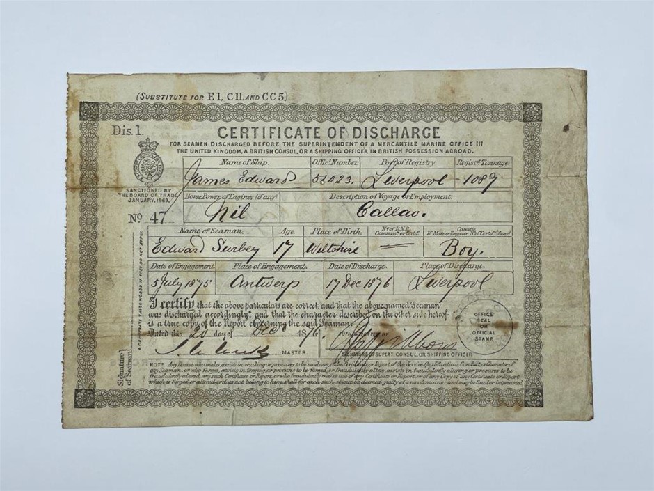• 1 x Certificate of record of service for Edward Turbey No 135 from 11 September 1874 to 30 June 1875