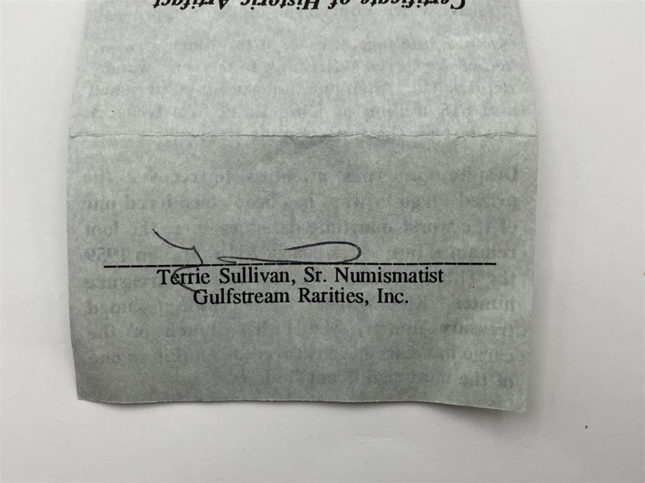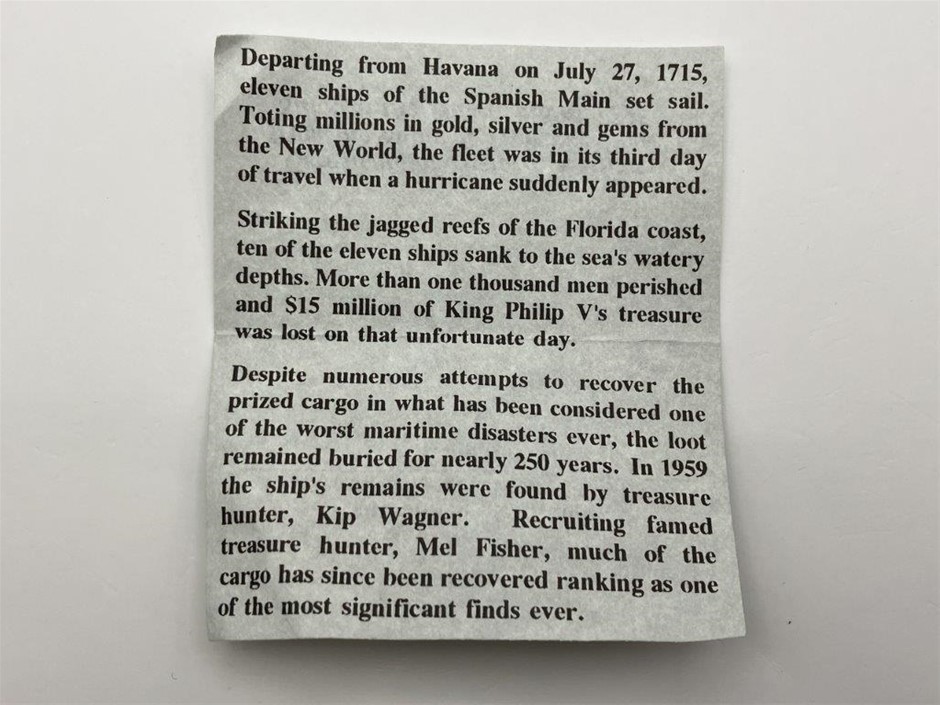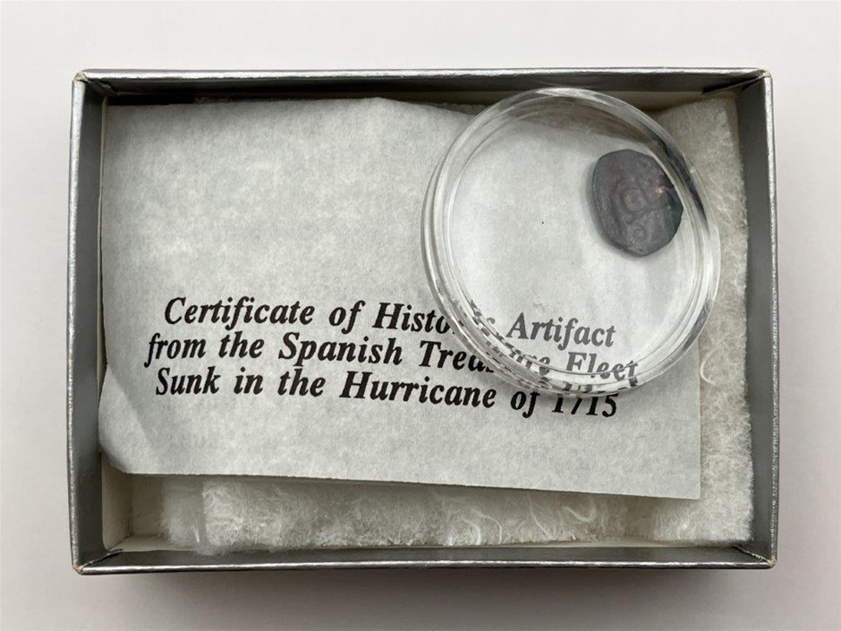 • 1 x Silver Historic Artifact from the Spanish Treasure Fleet 1715, together with certificate signed by Terrie Sullivan, Sr.Numismatist. Approx. 0.78gm