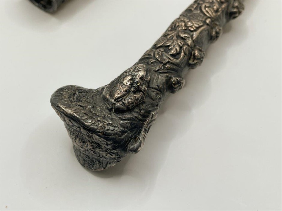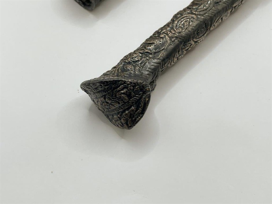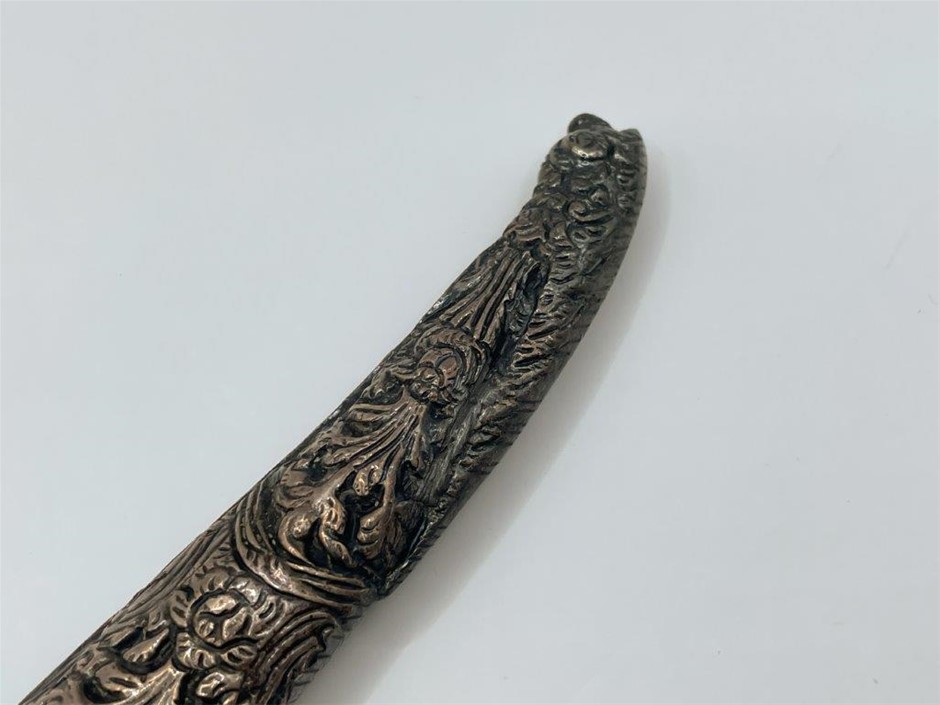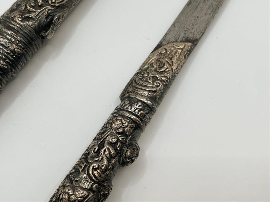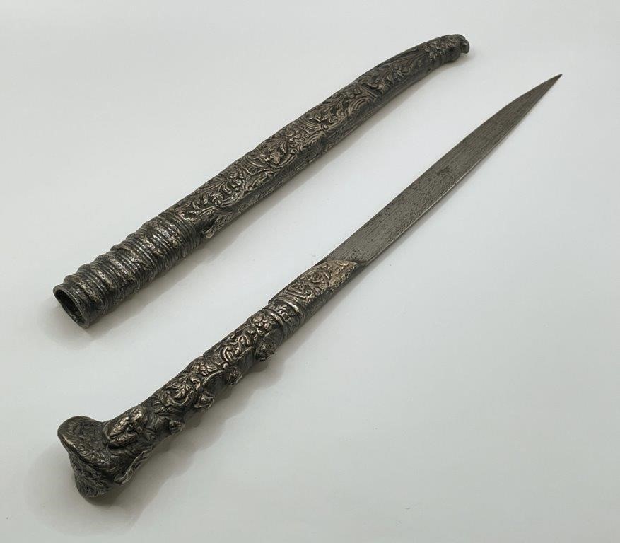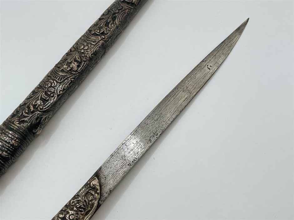 • Early to mid 19th century, single edge blade is 18cm long, forged from pattern welded steel, the handle and scabbard are covered with silver ornately decorated with a floral pattern, the handle pommel is splayed and has a flap on top for attaching to a chain and the scabbard has an identical flap on its front edge, at the bottom tip of the scabbard is a fish head, total length including scabbard 35.5cm. Blade a little loose in scabbard, otherwise fine.