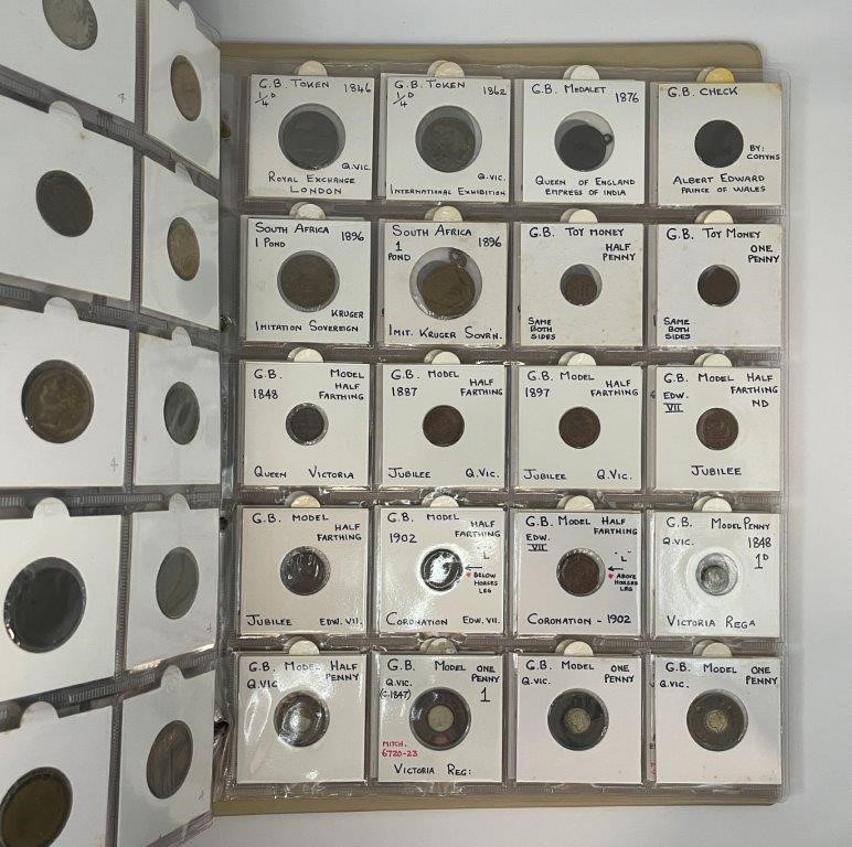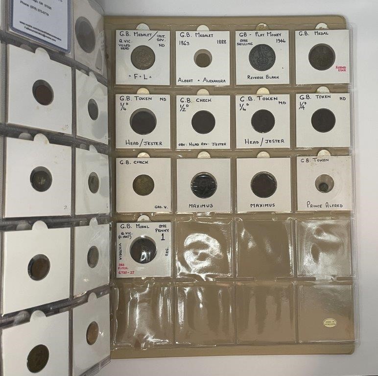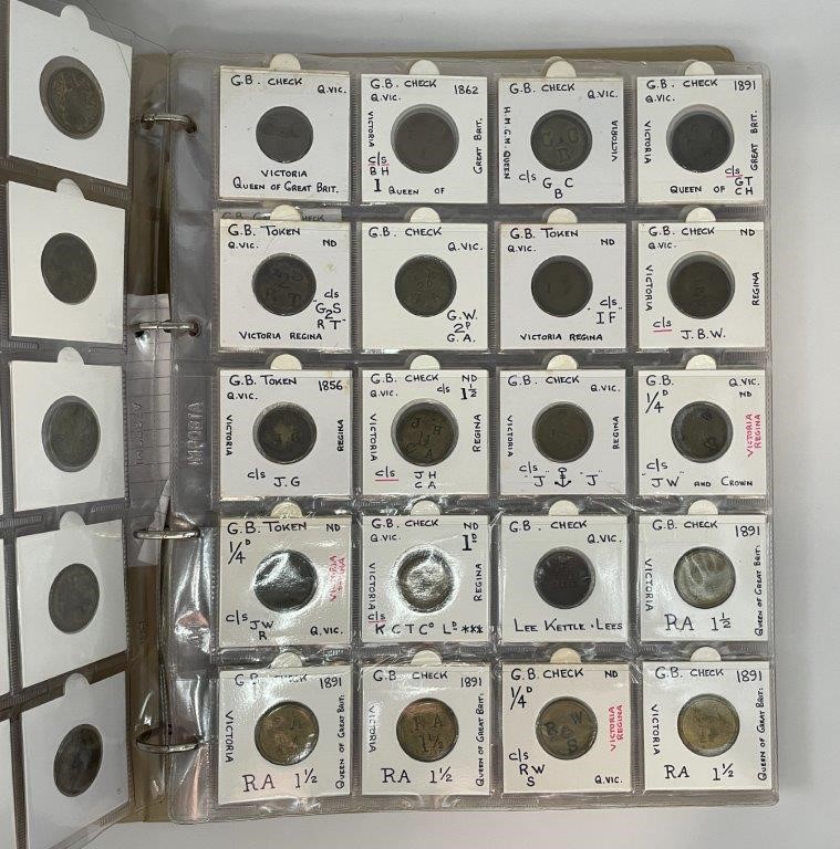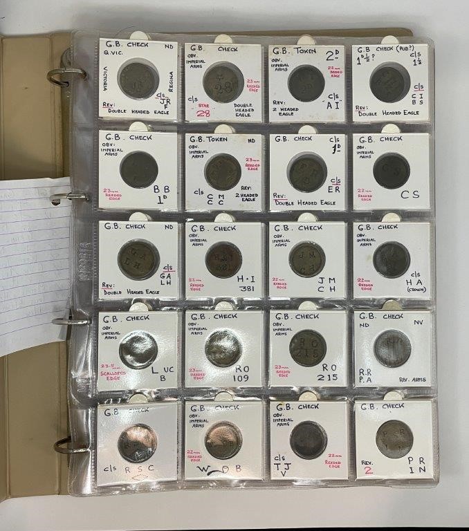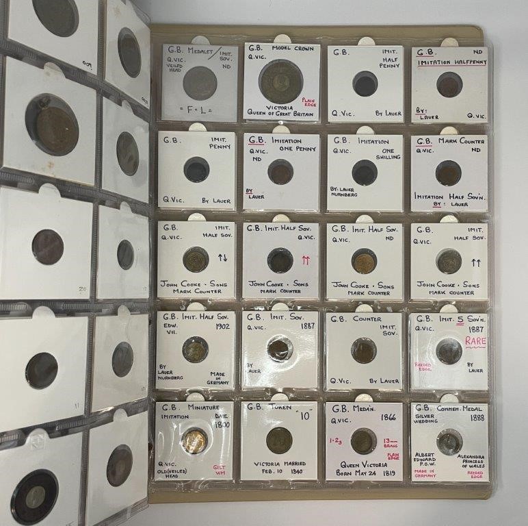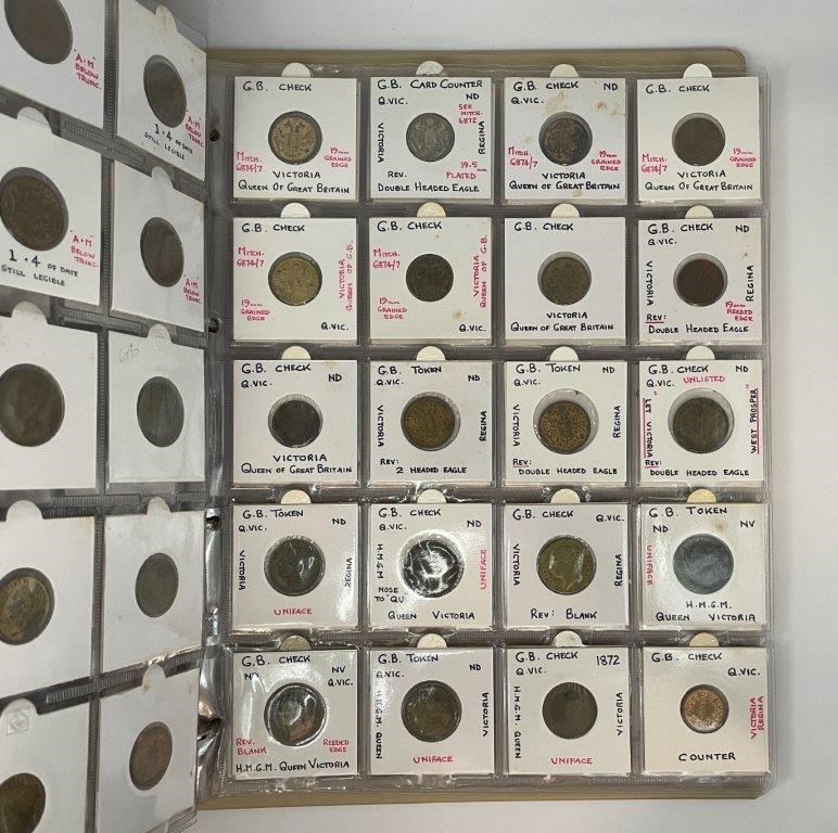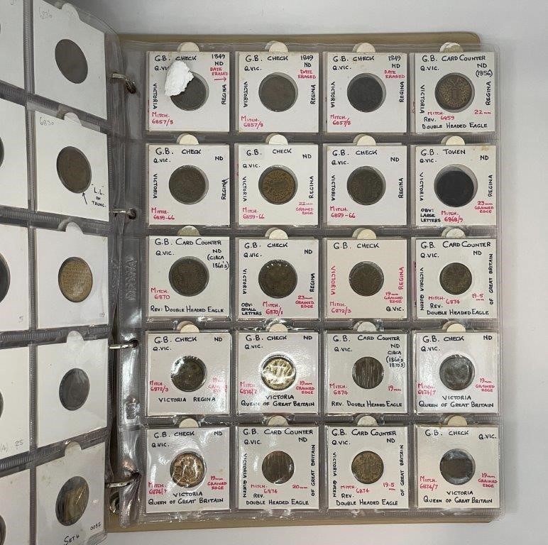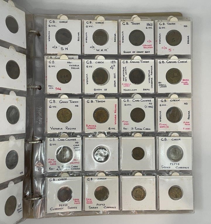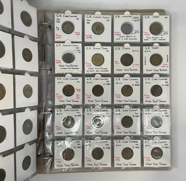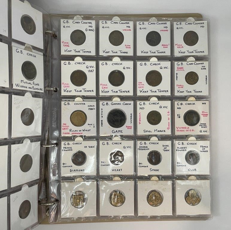 • Card Counters, in brass a ten in copper, includes model coins, many attributed with Mitchener numbers all in binder album, each neatly described in 2x2 holders, a comprehensive collection, mostly were struck in Birmington in 19th century. Fine - nearly uncirculated