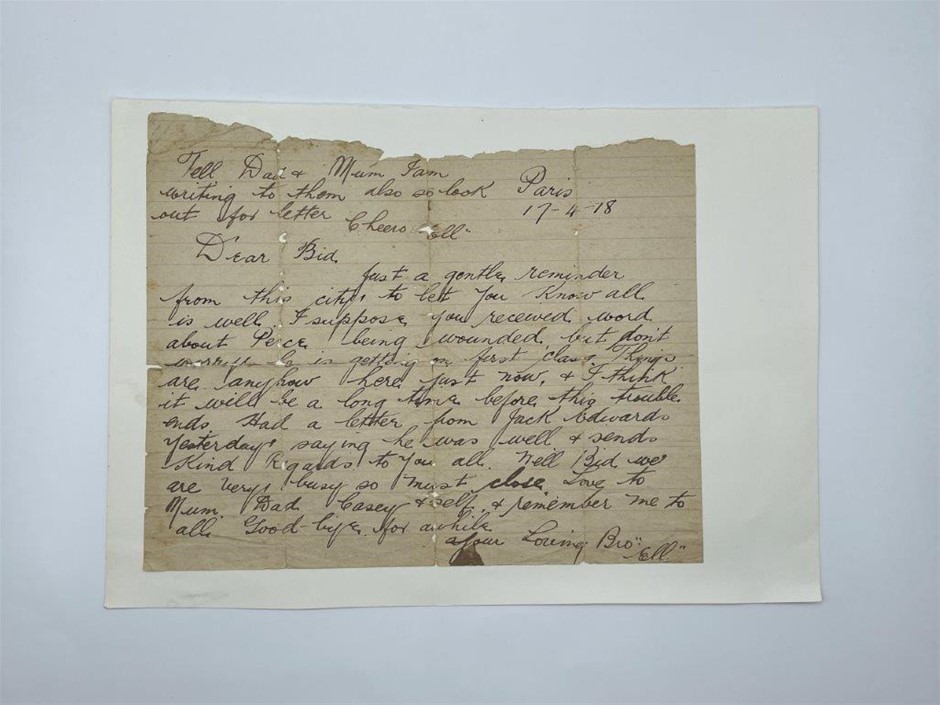 • 1 x WWI Correspondence letter, written from Paris, 17 April 1918, indicating that `I think it will be a long time before this trouble ends`, signed `your loving Bro, Ell`; with accompanying original photograph of WWI digger in uniform, signed, `To Annie with love from your brother Ell`. Fine.