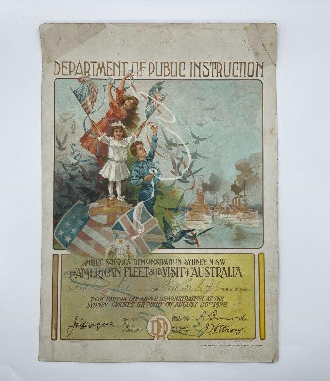 • 1 x Public Schools Demonstration Sydney N.S.W., to the American Fleet on its Visit to Australia, Department of School Instruction print on card paper of certificate (198x299mm) issued to school children who took part in the above demonstration at the Sydney Cricket Ground on August 26th 1908, named to Coralie Nix(?) of Fort St Model Public School. Some light foxing around edges and a few small paper splits at right edge, otherwise very fine.