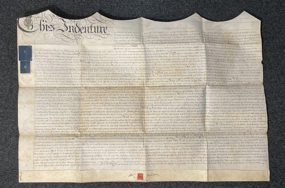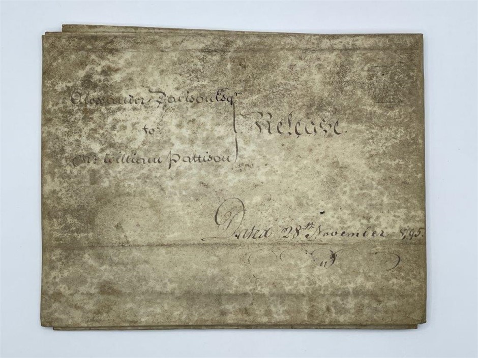 • 1 x George III, Indenture, 28th November 1795, written on vellum between Alexander Davison of Berwick and William Pattison of Berwick Upon Tweed, Carpenter, a release for the sum of £120, signed by Davison and wax sealed, duty stamps of II shillings and VI pence. Very fine.