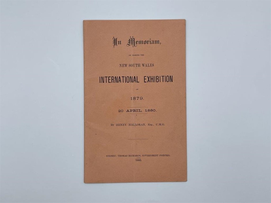 • 1 x In Memoriam, on closing the New South Wales International Exhibition of 1879, 20 April 1880, by Henry Halloran, Esq., C.M.G., soft cover booklet, 8pp, an original print by Thomas Richards, Government Printer, Sydney . Foxing, otherwise fine and rare.