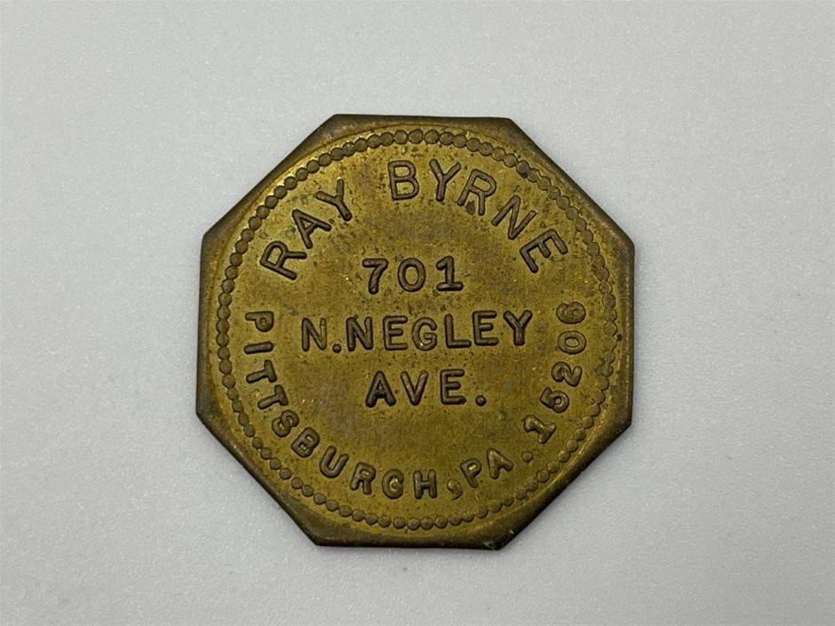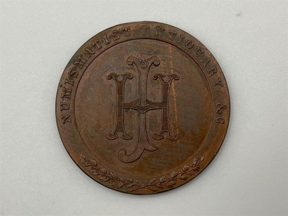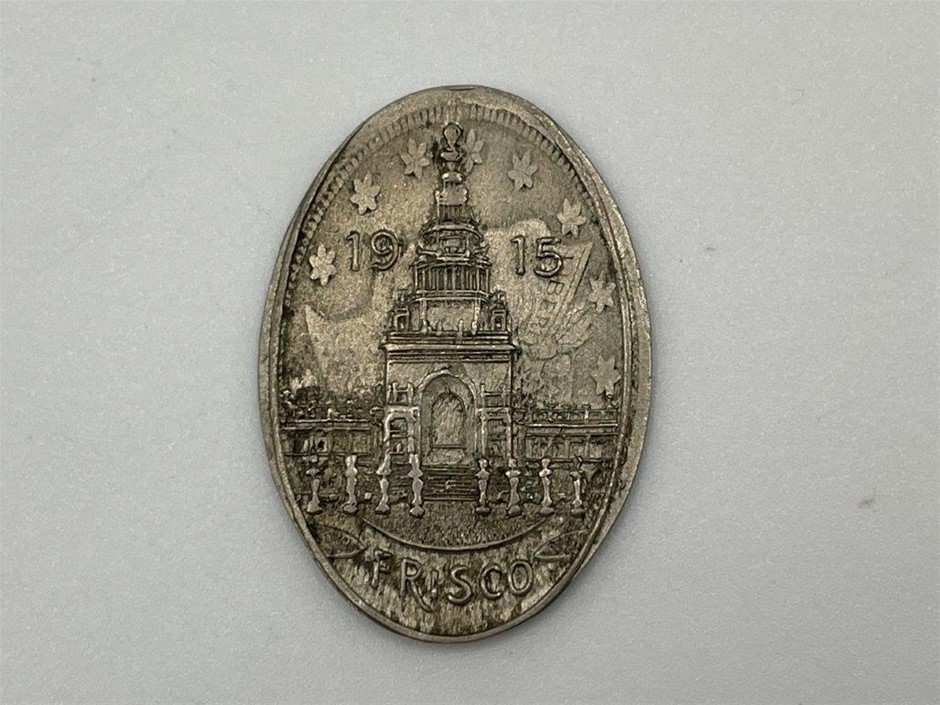 • Elongated farthing 1884 stamped Colombia Exposition 1893, elongated Indian head cent stamped Armour & Company/ Dainty/ Canned Meats/ Delicious/ Chicago/ obverse building Mfg & Liberal Arts Pan Am 1801, elongated Indian head cent 1903, stamped on one side 1915 Building (San Francisco) P.P.I.E., elongated nickel similar 1915 Frisco. 10th Olympiad Los Angeles 1932/ California Gold « dollar reverse. Numismatists advertising tickets or cards (G.H.Lovett GHL) WE ALL HAVE OUR HOBBIES/ Dedicated to coin and medal Collectors 1860 in copper 27mm (dia) (Rulau NY 491c) proof-like, Waldo C. Moore, Banker, Numismatist, Philatelist, Fowl Fancier 1911 in gilt brass 31mm, Ray Byrne Pittsburgh Good for one drink in brass octagonal 24mm (dia)W.W.Woodside, 1973, Pittsburgh 32mm (dia) 55 years of Fun with Numismatics, very fine - uncirculated