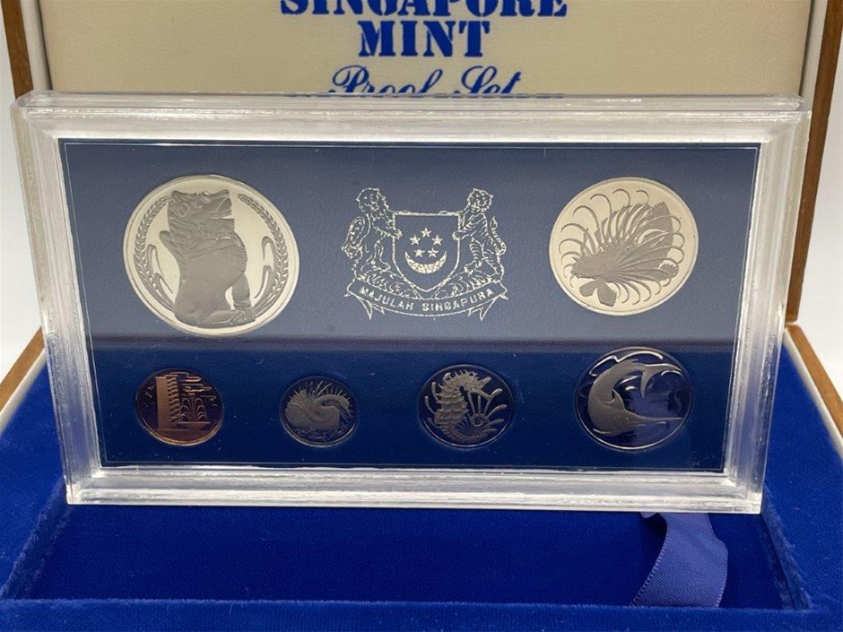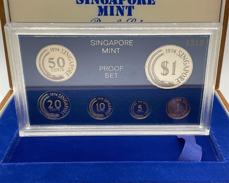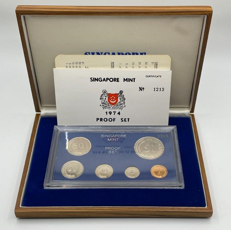 • 1 x Singapore Mint 1974 Proof Set, Certificated No. 1213, comprised of 6 x coins in $1, 50,20,10,5 and 1 cents, in plush lined wooden case, FDC