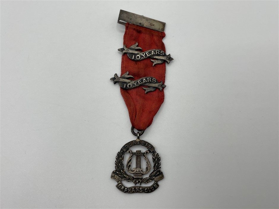 • 1 x Dunedin Orphans Club, in silver (25x27mm), with two 10 Years bars, no maker, ribbon and pin-back bar suspension
