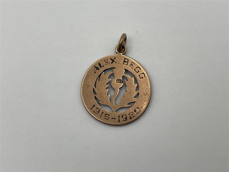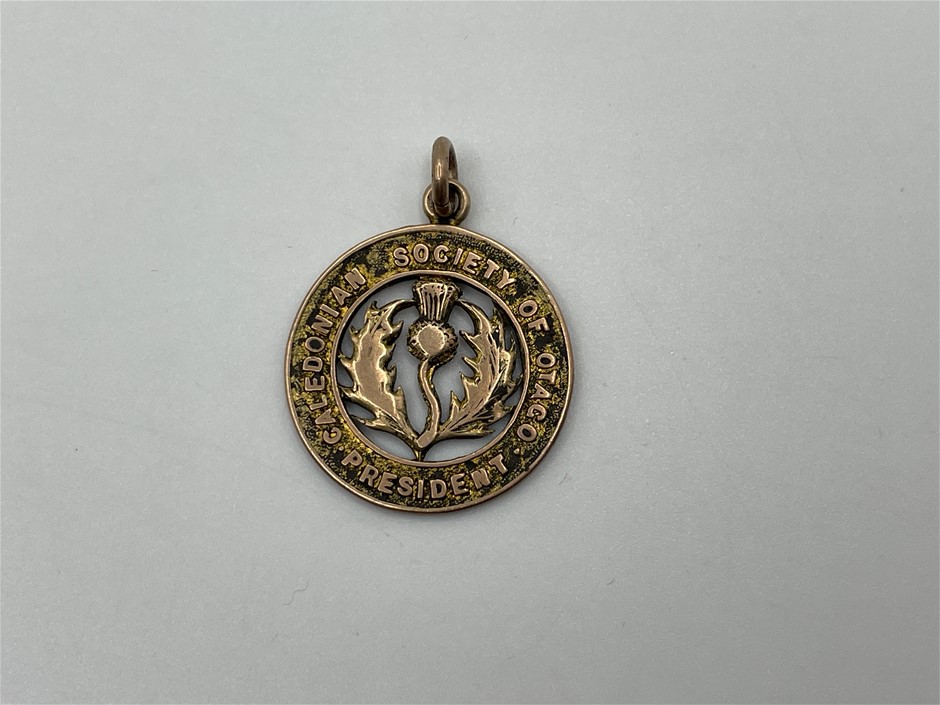 • 1 x Caledonian Society of Otago, President`s fob medal, struck in voided gold, hallmark visible(9Ct, 4.7g, 23mm), no maker, reverse inscribed `Alex.Begg`/1916-1920`
