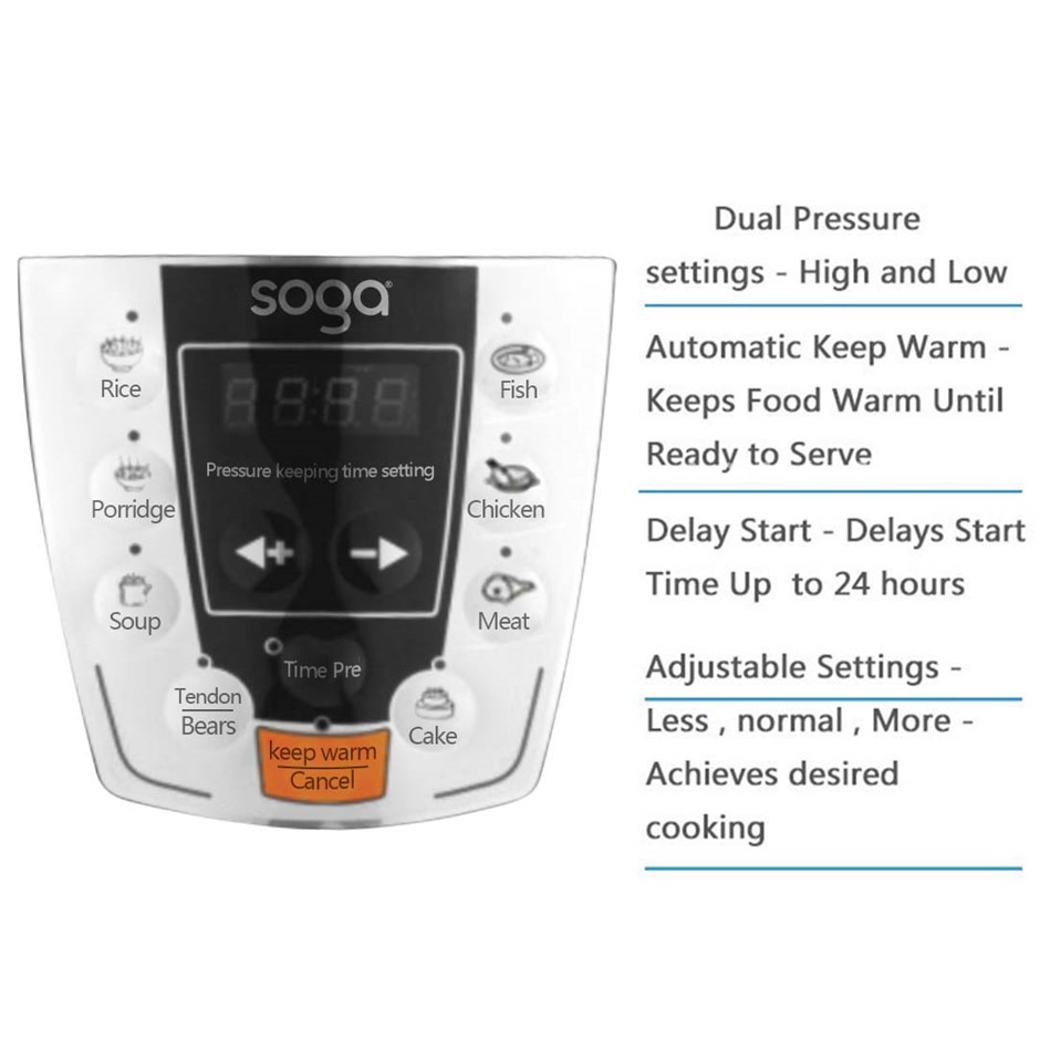 • Simple Operation - this pressure cooker features versatile built-in programs, supporting cooking functions for Fish, Chicken/Poultry, Meat/Stew, Rice/Steam, Porridge, Soup, Beans/Multigrain, Cake and Keep Warm. You can set the start time for cooking by simply pressing the button through Manual Cook function.