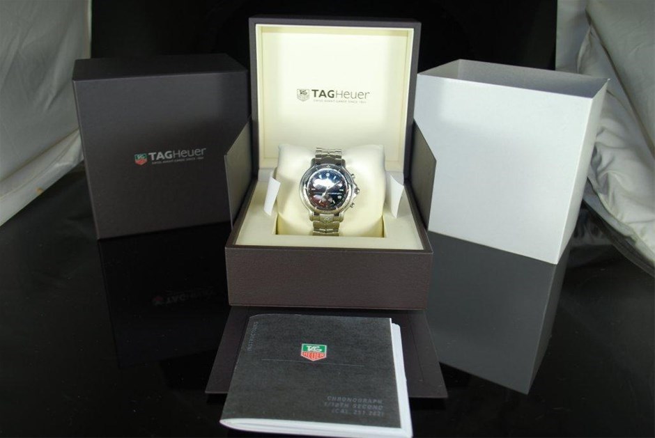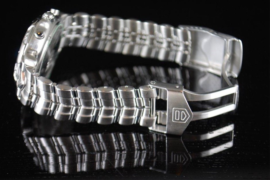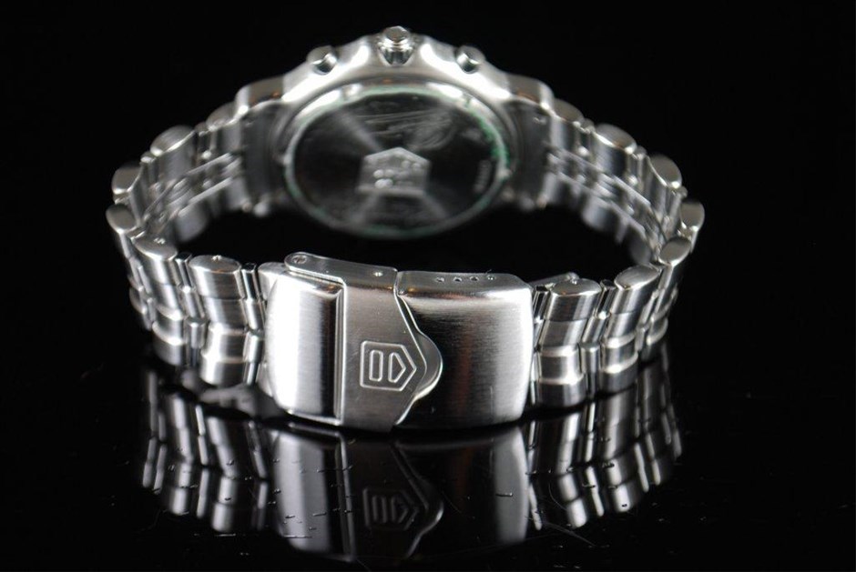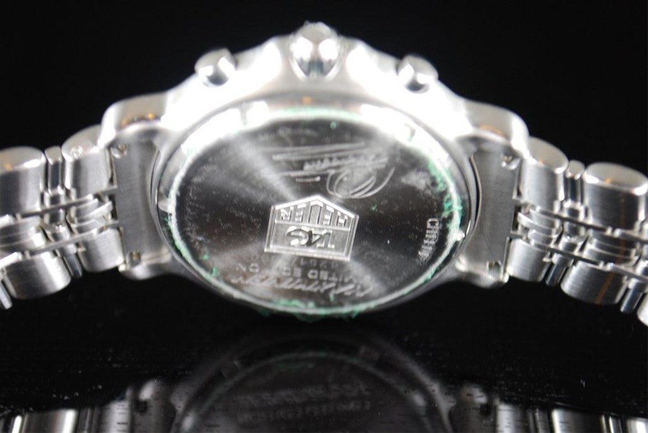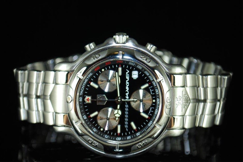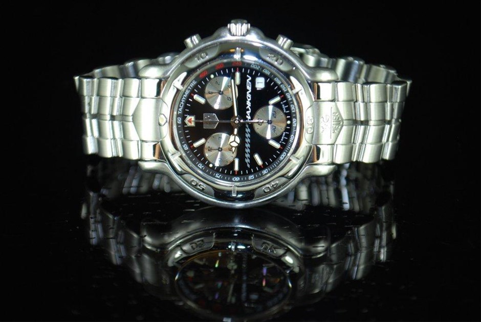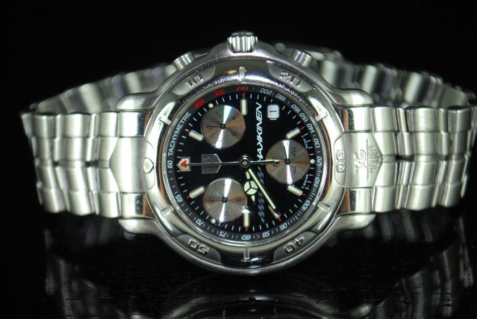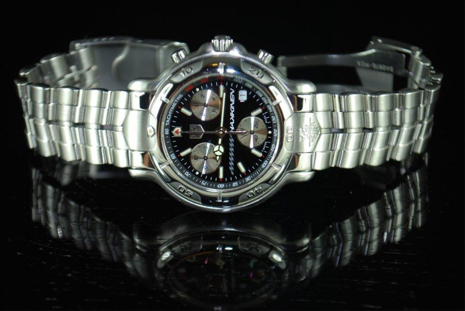 RRV $8,325.00 - One Authentic Gents Tag Heuer 6000 Series Mika Hakkinen Signed Signature 1/10th chronograph "Limited Edition" wrist watch with a black dial.