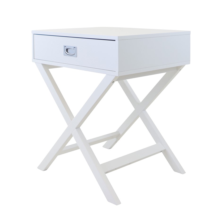 An easy match for contemporary ensembles, this sleek end table ticks the boxes for both style and function. Stylish Cross Base legs this design is crafted from MDF. Drop pull hardware augments a single drawer that glides smoothly to reveal ample storage space for small-scale must-haves that you want out of sight but close at hand.