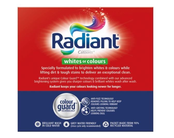 Radiant Whites and Colours Fabric Powder is specially formulated to brighten whites and colours while lifting dirt and tough stains to deliver an exceptional clean. Radiant's unique Colour Guard technology combined with advanced brightening system gives you sharper colours and brilliant whites wash after wash. Keeps your colours looking newer for longer. Comes in 2 kg pack.