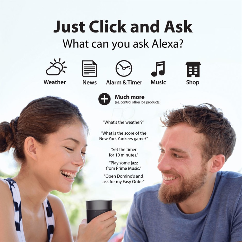 Compact Size. Portable Design. Powerful SoundThough small in size, the Aud Click uses a 360° omnidirectional audio with a very unique volume adjustment wheel to give you crisp sound. The small size allows portability so you can travel and enjoy great music and Alexa on the go.
