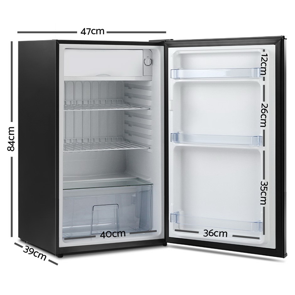 Specifications: Capacity: 86L Size: 95L Chiller compartment capacity: 5L Fridge temperature range: 0°C - 10°C Chiller compartment temperature range: -4°C - 0°C Power: 60W Voltage: 220V-240V Refrigerant: R134a; R600a Colour: Black