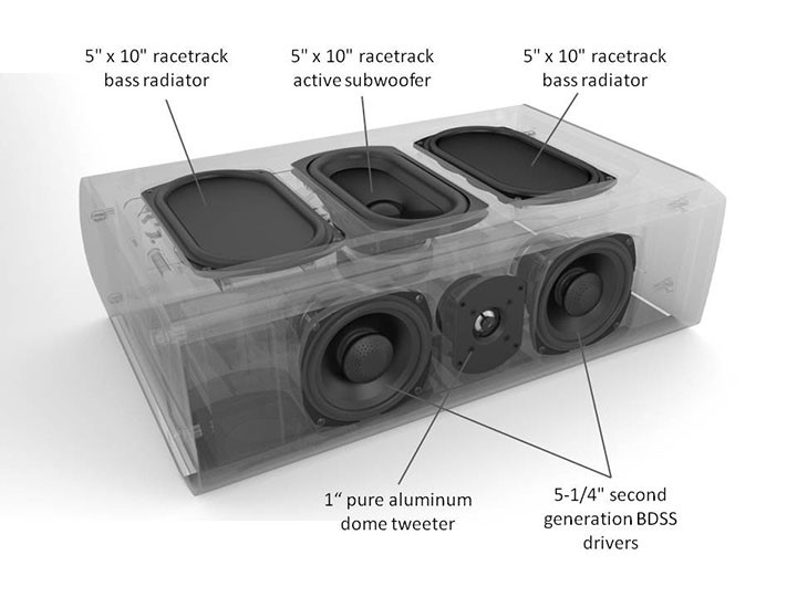 • Bass Radiator: 2 x 10" (25.40cm)H, 5" (12.70cm)W Racetrack Planar Bass Radiator